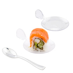 100 CLEAR 3.7" PLASTIC FISH TASTING PLATES AND 100 PLASTIC 4" SPOONS