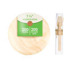 200 ROUND 8" WOOD PLATES AND 200 BAMBOO FLATWARE SETS