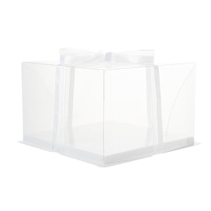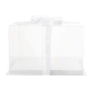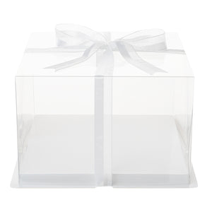 SQUARE CLEAR PLASTIC CAKE BOX - WHITE BASE, GRAY RIBBON