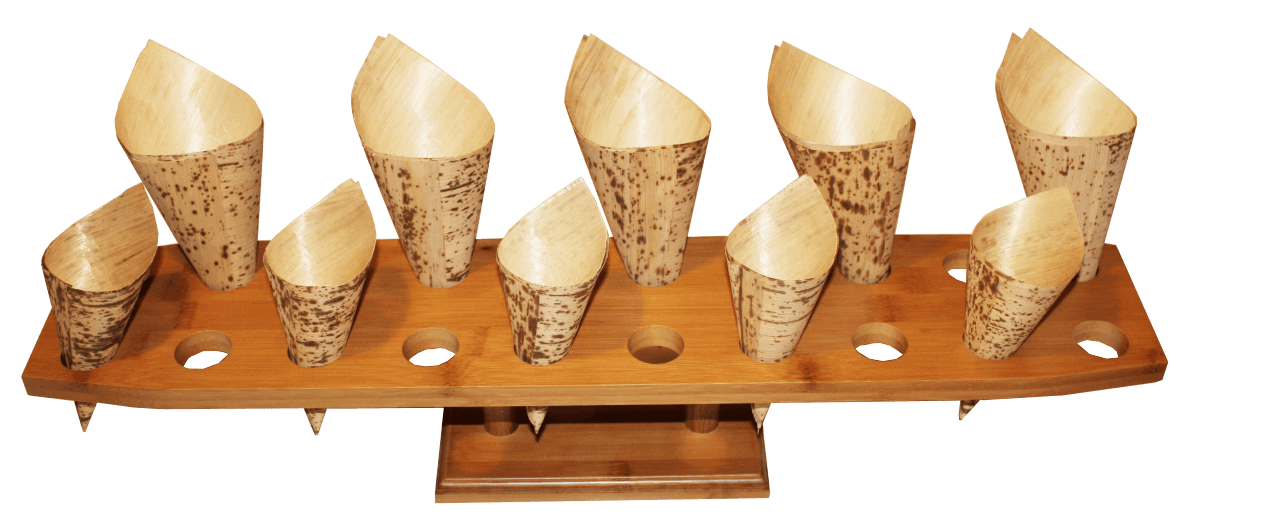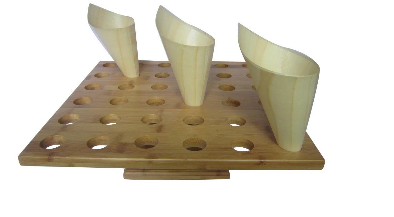 Do you need a little help creating the ultimate food display? If so, consider using food cones and displaying them in charming bamboo cone stands. You can fill bamboo cones up with a variety of food ingredients like nuts, fruits, mini breads, mini donuts and much more. Although just by using bamboo cones you can create a unique food presentation you will still need to have a secure place to display your cones, which is one reason you also need to use bamboo cone stands.