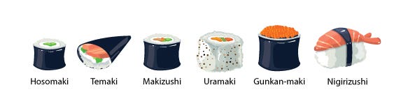 - Gunkan-maki “battleship roll” - A variant of maki, this roll is a hand-shaped rice mound wrapped with a strip of nori seaweed extending over the rice, creating a bowl that holds the topping.