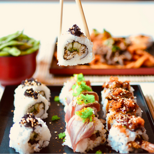 - Uramaki “inside out roll” - Similar to maki but the filling is wrapped in seaweed then wrapped in rice. These rolls could often be seen topped with thin strips of seafood, veggies, or fruits.