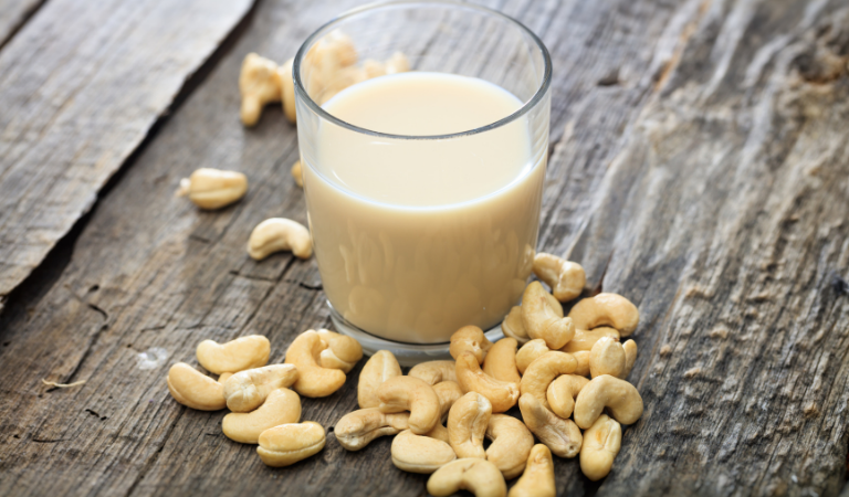 Cashew milk is made by blending cashews with water. It is known for its creamy texture that mimics dairy milk, making it a popular dairy-free substitute for creamer in coffee. It is slightly sweet and less nutty than other nut-based milk. Cashew milk is low in calories, protein, and features a variety of nutrients.
