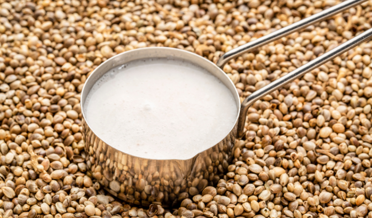 Hemp milk is made from hemp seeds and water. The hemp plant contains tiny amounts of tetrahydrocannabinol (THC), the psychoactive component of cannabis. However, hemp milk does not possess enough THC to cause psychoactive effects. Hemp milk features a thin, watery texture and nutty taste. This milk substitute has a similar amount of fat as cow's milk but fewer calories, protein, and carbohydrates.