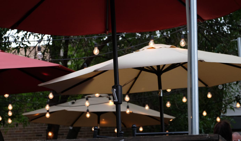 and added patio seating and tables with guests sitting under a canopy of string lights.