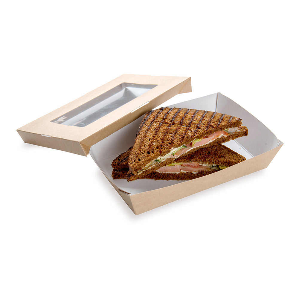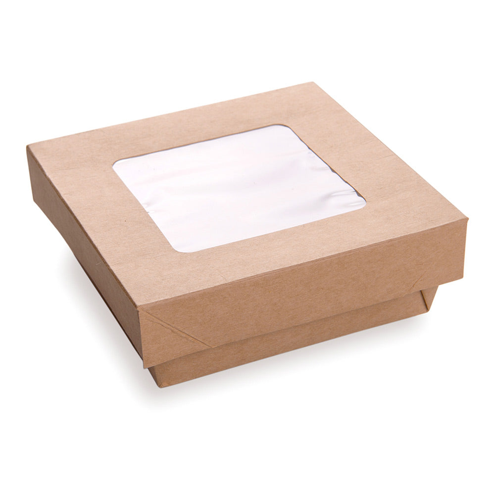 Cafe Vision 12 oz Rectangle Kraft Paper Mini Bio Take Out Container - Two Windows - 4 1/4" x 3 3/4" x 1 3/4" - 200 count box4 1/4" x 3 3/4" x 1 3/4"RWA0177