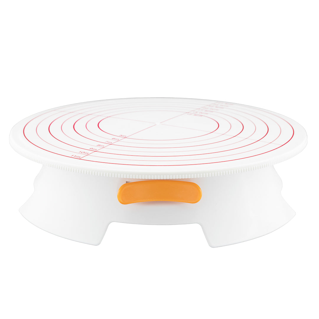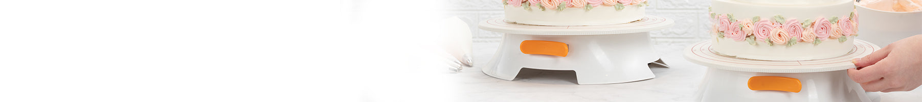 Our selection of cake turntables is equipped with rotating mechanisms that make it easy to turn cakes while decorating and keep them in place when tediously frosting specific areas. The non-slip base is great for safely placing desserts onto our rotating cake stands without the risk of messy accidents or cakes toppling over. With a heavy-duty construction and measurement markers, our selection of cake spinners is designed to securely hold cakes of all shapes and sizes. From compact models for smaller cakes to larger ones for grand creations, our selection of cake turntables caters to all types of dessert presentations.