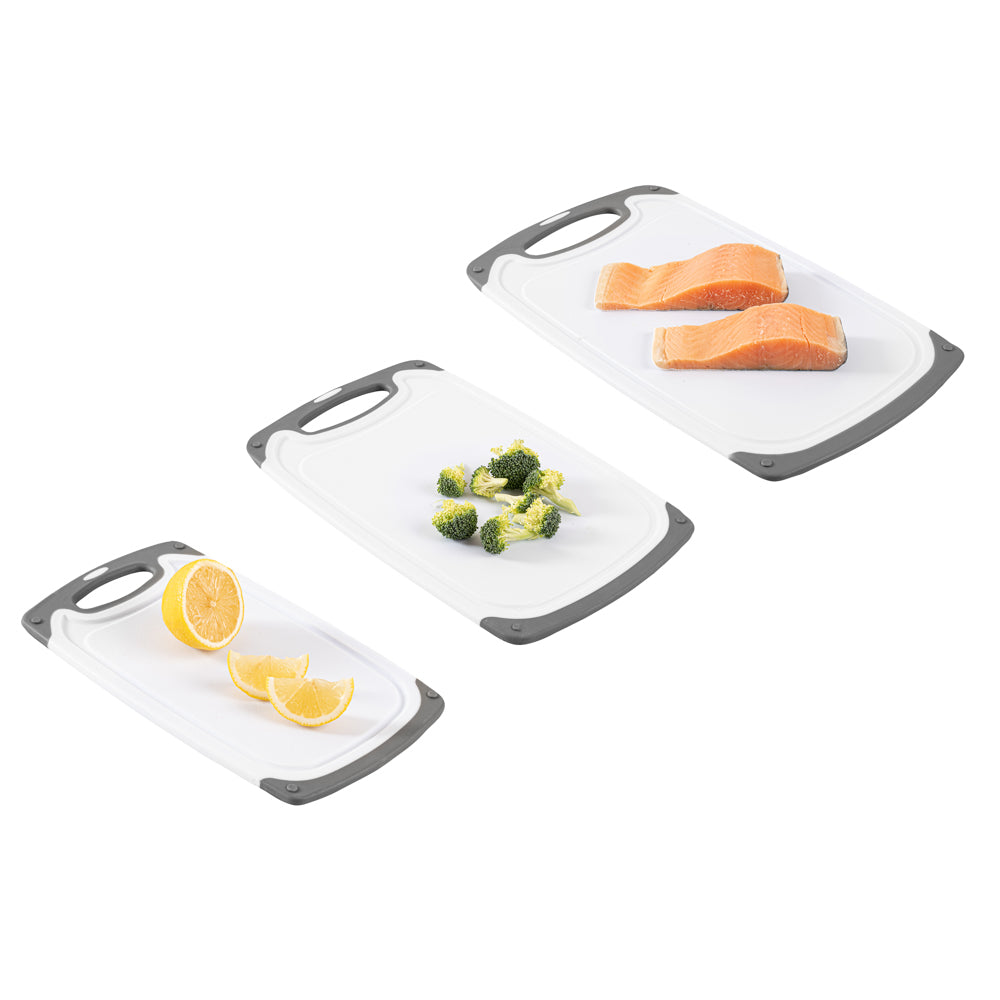 Comfy Grip White and Gray Plastic Cutting Board Set - Includes 3 Boards, with Juice Groove, Handle - 1 count box15 3/4" x 9 1/2" x 1"RWT1251GRW