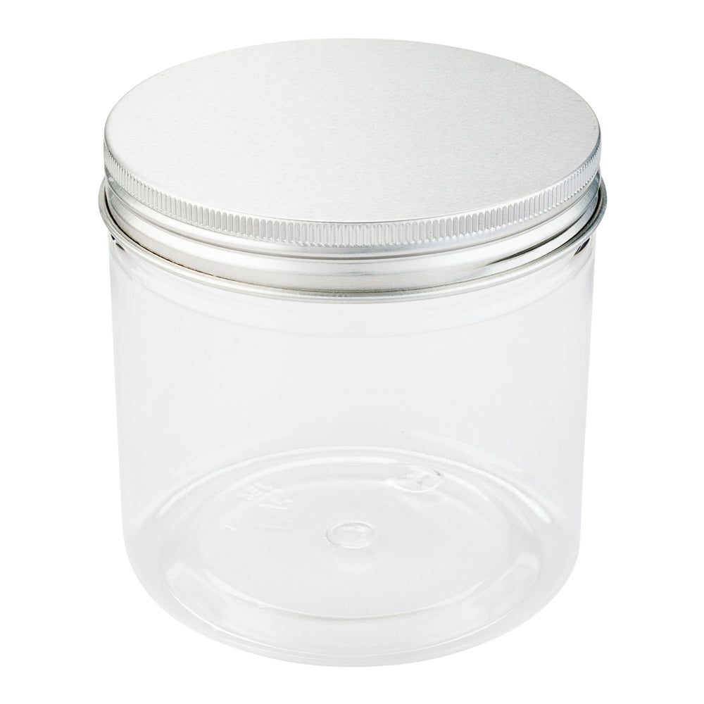 Mini Serve 17 oz Round Clear Plastic Candy and Snack Jar - with Aluminum Lid - 3 1/2" x 3 1/2" x 3 3/4" - 100 count box3 1/2" x 3 1/2" x 3 3/4"RWP0271C
