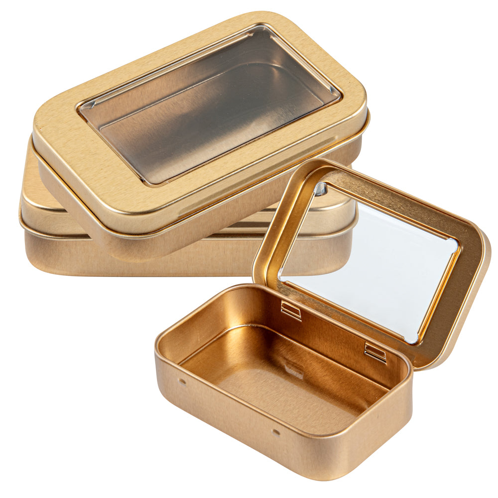 Chef 101 4 oz Rectangle Gold Tin Container - with Window Lid - 100 count box3 3/4" x 2 1/4" x 0 3/4"RWM0169GD