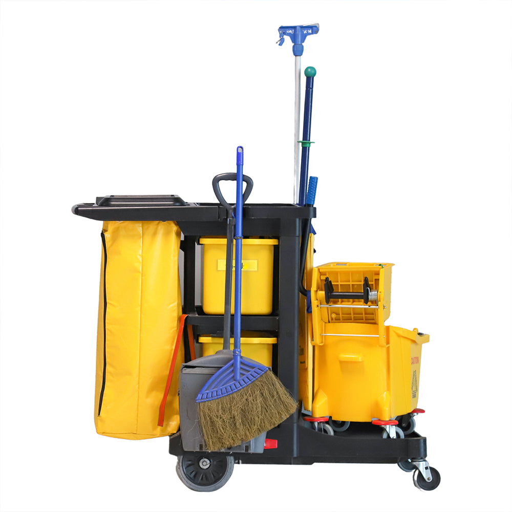 RW Clean Black Plastic Heavy-Duty Janitor Cart - 3 Shelves, 20 gal Nylon Bag, Hinged Lid - 44 1/4" x 20" x 37 3/4" - 1 count box44 1/4" x 20" x 37 3/4"RWT0473