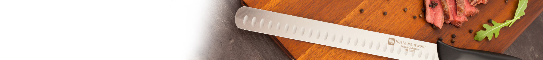 Our professional slicing knives feature blades constructed from high quality, ultra-strong German steel. Plus, they’re designed with a long 11 inch blade that makes it simple to execute neat and precise slicing. In addition, Restaurantware’s slicing knife features a Granton edged blade that has multiple shallow divots -- keeping sliced meats and ingredients from sticking to the knife.