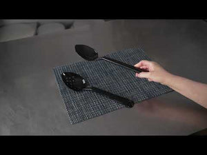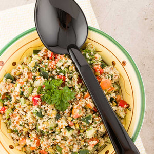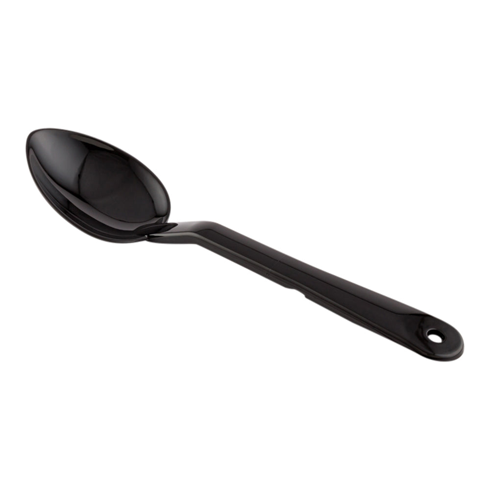 Give your salad bar, fro-yo toppings bar, buffet, or catered event a convenient upgrade with our Cater Tek Black Plastic Catering Service Solid Spoon. Measuring 11 inches long, this plastic serving spoon is perfect for serving appetizers, side dishes, toppings, salads, entrees, desserts, and more! Its durable plastic construction is dishwasher-safe, and its polished black finish adds a stylish touch to any setting. Equipped with a built-in resting notch, this buffet serving spoon is designed to rest on the side of buffet trays and serving bowls to prevent messes. Although intended for reuse, and conveniently dishwasher-safe, you could also use these 11-inch L x 2.6-inch W plastic spoons as disposable serving utensils at corporate luncheons and other off-site catered events. Shipped in a 1 count box.