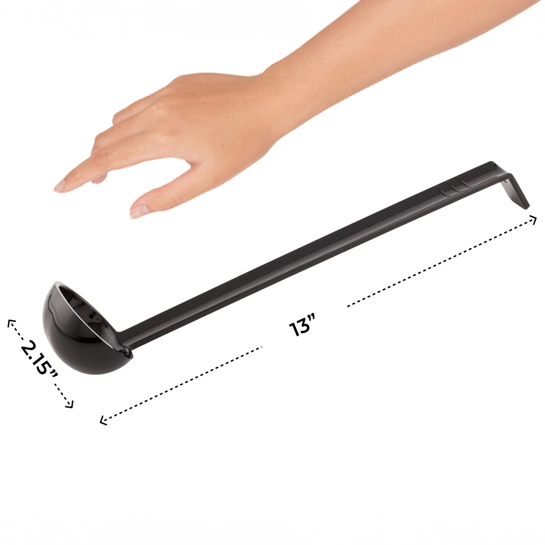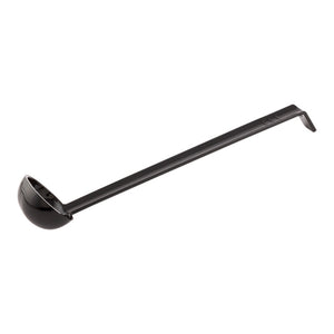 Expertly pour tomato sauce on your pizza dough with our Voga 1-ounce Black Plastic Sauce Ladle. Featuring an angled design, this ladle spoon provides easy handling to prevent messy spills while serving. The hook of this sauce ladle can be securely placed on the rim the pot for quick access to your gravy or salad dressing. Equipped with a deep bowl, this gravy ladle controls the portion size of each serving. Made from premium plastic, this salad dressing ladle is dishwasher-safe to shorten the cleaning process at your restaurant, bakery, or catering service. With a stylish black finish, this plastic ladle matches the existing utensils in your commercial kitchen. This black ladle measures 13 inches long and can hold up to 1 ounce of your sauces. Sold in a 1 count box.