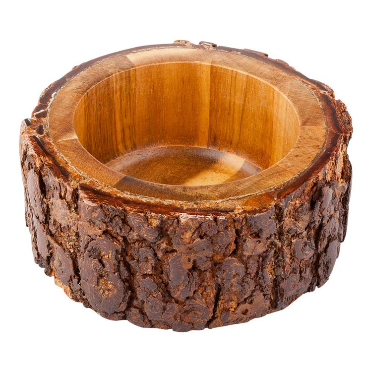 These singularly distinct Bio Tek wooden bowls are a rustic and unique way to serve food samples and appetizers. Featuring an all natural bark exterior, these serving bowls can hold anything from chips, to dips, to desserts, to salads, and just about any kind of appetizer. They're carved from acacia wood, ensuring sustainability as well as durability. And their basins are deep enough to hold any type of small food portion or appetizer. As food bowls go, these wooden bowls are conversation starters, and will definitely add a rustic and earthy aesthetic to any restaurant, cafe, or catered event. Each Small Round Acacia Wood Serving Bowl measure 4 inches, hold up to 10 ounces and is shipped 1 per box.