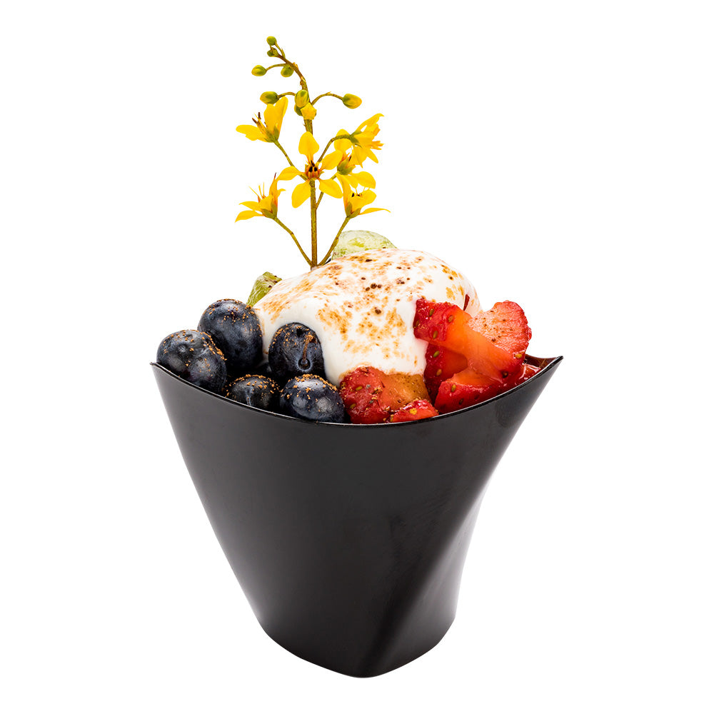 Serve delectable single-portion treats with our Mini Serve 4-ounce Black Plastic Mini Crescendo Cups with Silver Plastic Mini Forks. These dessert cups and tasting forks are crafted from robust, high-quality plastic and are disposable to provide an easy cleaning experience after meals. The sleek twisted shape and black finish of these parfait cups creates an upscale backdrop to showcase your colorful culinary creations while the shiny silver finish of these cake forks lends an elegant touch. With a capacity of 4 ounces, these black cups are perfectly sized for doling out samples of crème brûlée, miniature fruit tarts, or artisanal sorbets. Featuring sturdy handles and prongs, these plastic forks are ideal for spearing bites of cheese, slicing into petit fours, or scooping up crumbs of decadent chocolate cake. These decorative cups measure 3 inches long by 3 inches wide by 2.75 inches tall and have a capacity of 4 ounces, while the included dessert forks measure 4 inches long. Each order includes 100 cups and 100 forks.