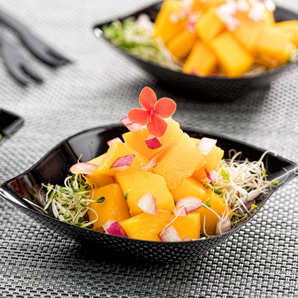 Bring an artistic flair with our Mini Serve Square Black Plastic Comma Plates with Silver Plastic Mini Forks. Constructed from high-quality PS plastic, these serving plates and single-use forks are disposable, providing an efficient cleanup after events. These disposable dishes feature an askew comma design and a chic black finish for a disposable yet refined look. Featuring a shiny silver finish, the included tasting forks are designed to effortlessly enhance the presentation of your tantalizing dishes while standing up to hefty bites with their strong and sturdy handles. With raised rims, these plastic plates provide added stability and help prevent spills, ensuring a mess-free dining experience for your guests. These appetizer plates measure 3.5 inches in length by 4.5 inches in width by 1 inch in height, while the included silver plastic forks measure 4 inches in length. Each order includes 100 plates and 100 forks.