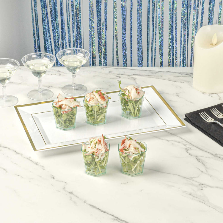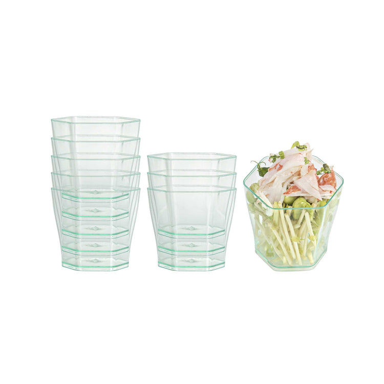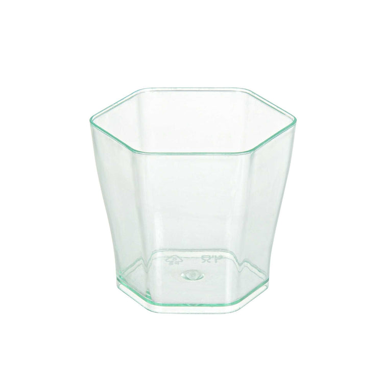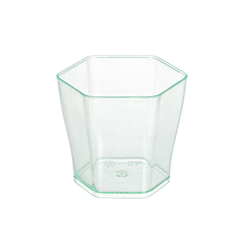 Introduce an element of elegance to your exquisite desserts with our Mini Serve 2-ounce Hexagon Seagreen Plastic Glasses. Crafted with sturdy PS plastic, these seagreen hexagon glasses are built to last, ensuring their suitability for any event. The signature hexagonal design, coupled with the enchanting seagreen finish, adds an artistic touch to your sweet or savory treats, making these plastic hexagon glasses an upscale option for mousse dishes or dessert offerings. These recyclable plastic dessert glasses are disposable, making the cleanup process a breeze. Holding up to 2 ounces with compact dimensions measuring 1.75 inches in length by 1.75 inches in width by 1.75 inches in height, these disposable plastic dessert glasses are ideal for elegantly serving single-serving portions. Sold in a 100 count box.