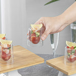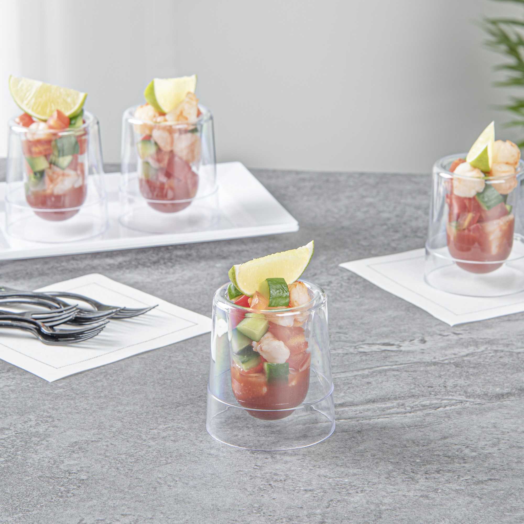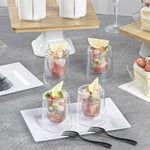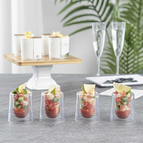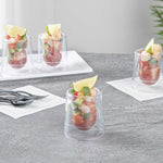 Present beautiful colored cocktails in our 2-ounce Round Clear Plastic Double Walled Cups. With double-wall clear construction, these uniquely designed dessert cups are a sleek and stylish way to serve ice cream, parfaits, yogurts, fruit, or other delectable snacks. Walled in and centered, this eye-catching clear plastic cup is perfect for serving sweet treats at wedding receptions, banquets, or dessert tables at catered events. Made from plastic, these clear 2-ounce cups are also ideal for sustainable and trendy cafes, ice cream shops, or bakeries. These disposable drink cups make cleaning easy. With a transparent finish, these round plastic cups help you stylishly present your refreshing drinks. Each 2-ounce double wall cup measures 2 inches in diameter by 2.5 inches in height. Sold in a 20 count box.