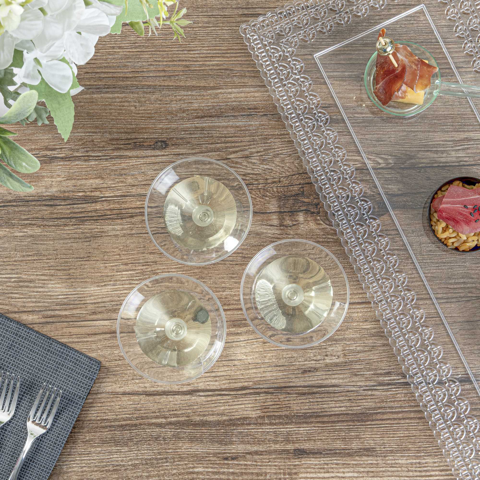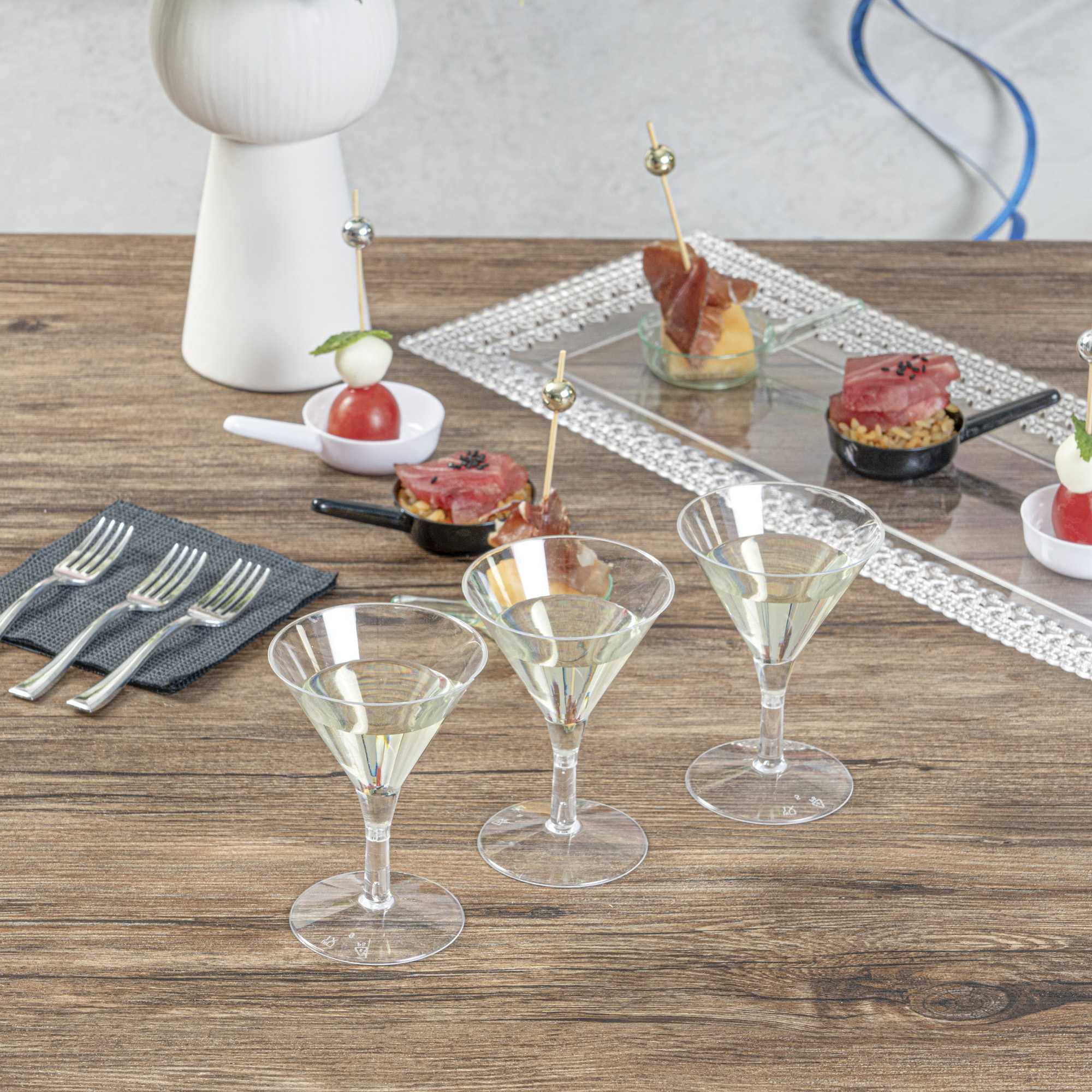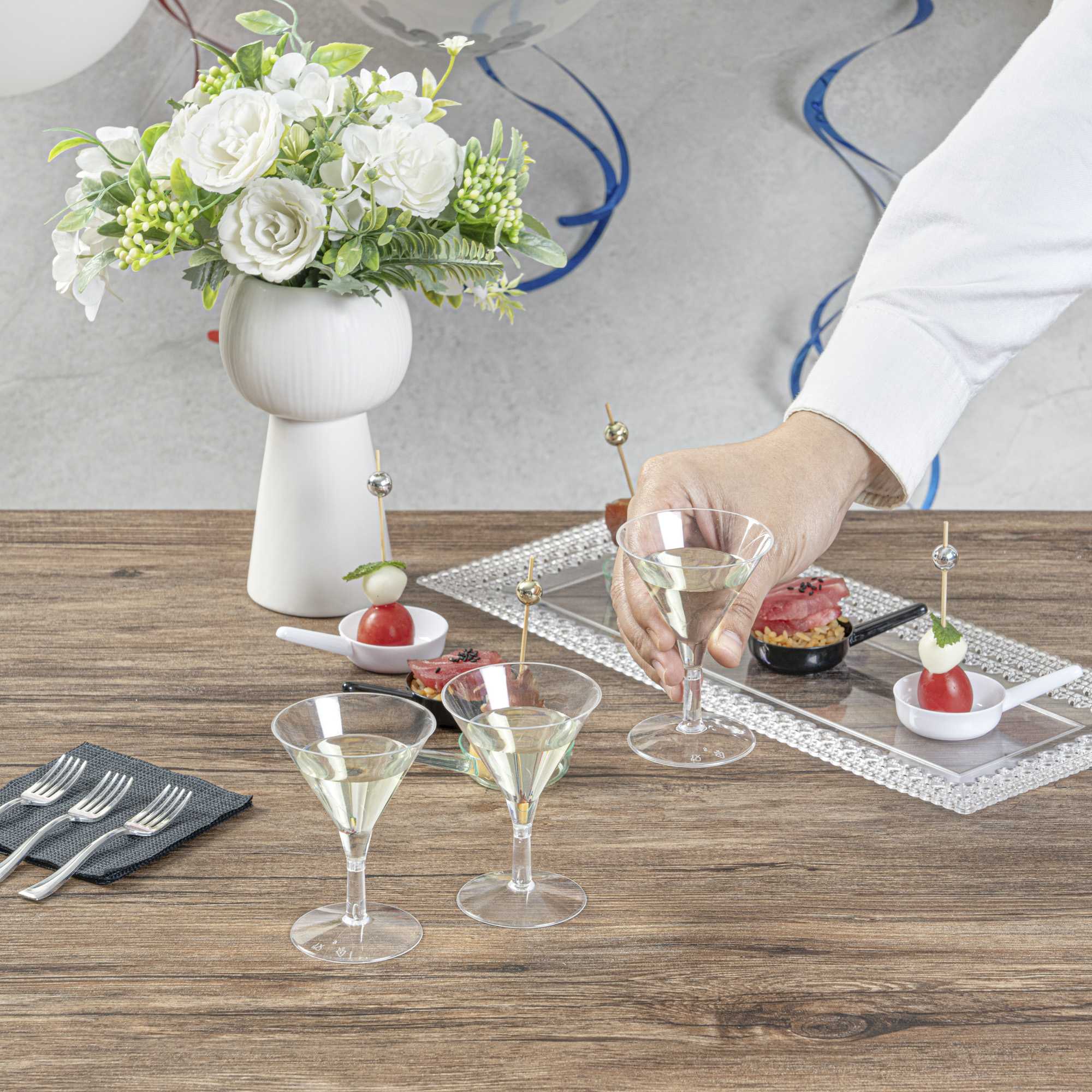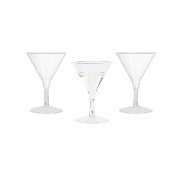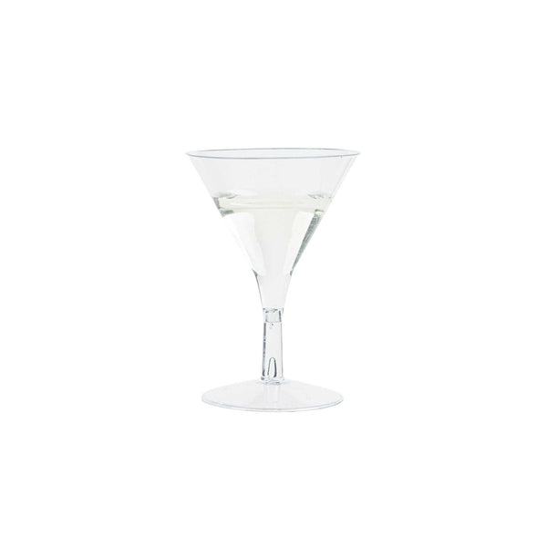 Serve outstanding mini cocktails in our 2-ounce Round Clear Plastic Mini Martini Glasses. With an attractive design, these mini plastic glasses are the perfect serving solution for miniature dessert courses and specialty cocktail tastings at special events and catered parties. These plastic cocktail glasses come unassembled in 2 pieces to save storage. Made from premium plastic, these mini martini glasses are conveniently disposable and recyclable. With their crystal clear construction, these mini martini glasses are designed to beautifully showcase your desserts, appetizers, cocktails, and more. Each of these mini cocktail glasses measures 2.5 inches in diameter by 3.75 inches in height and has a capacity of 2 ounces. Shipped unassembled in a 10 count box.