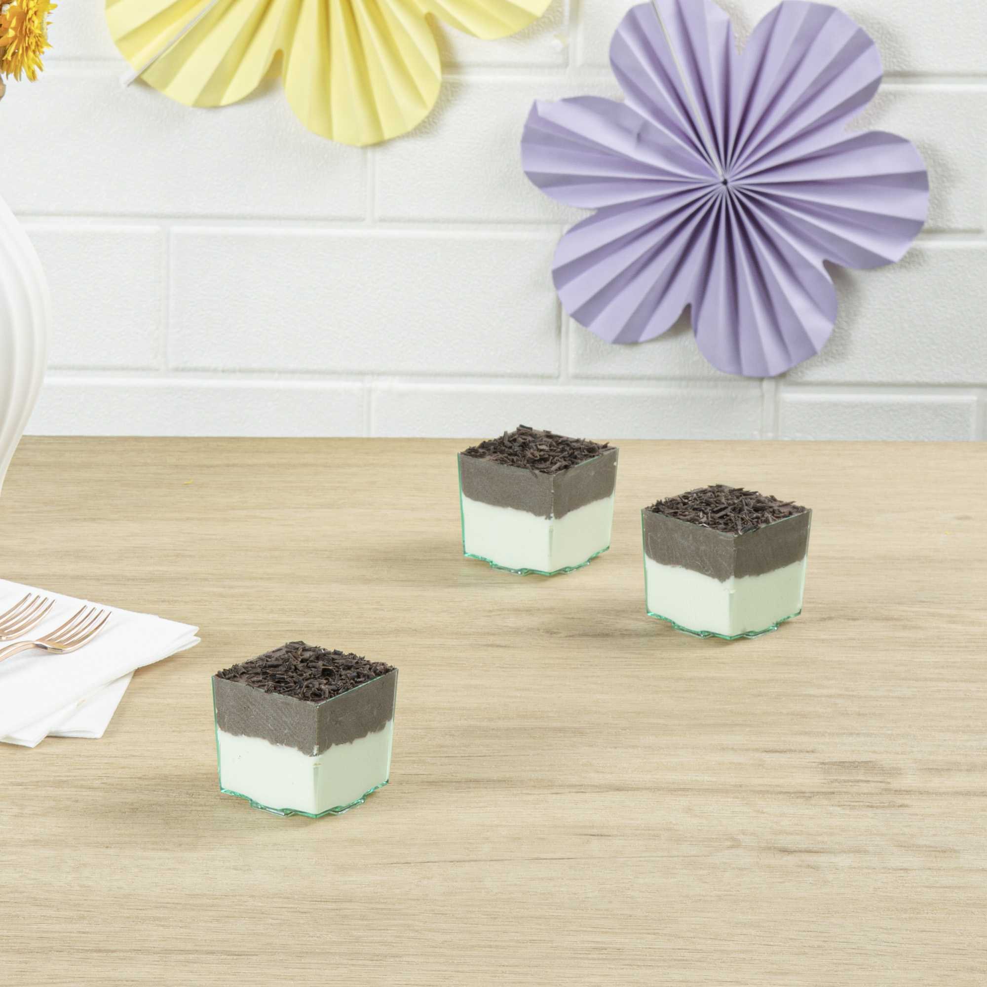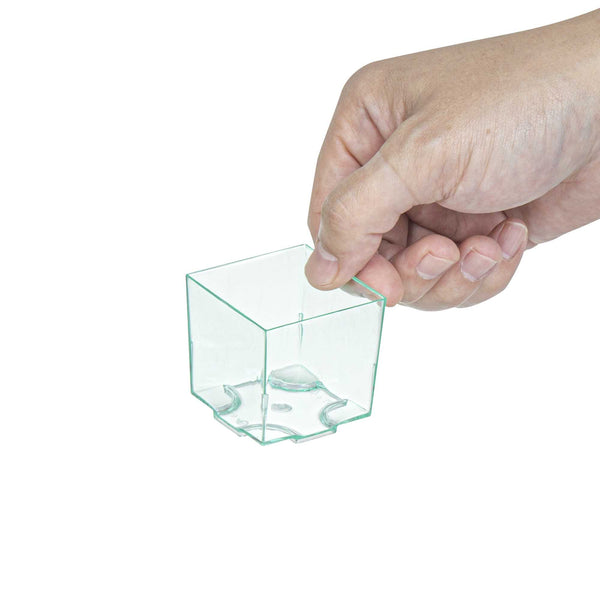 Incorporate a chic touch to your servings using our 2-ounce Square Seagreen Plastic Quadrato Cups. Crafted with premium plastic, these seagreen quadrato cups are resilient and do not crack easily. Designed with a smooth rim, these seagreen plastic cups provide a comfortable user experience void of accidental scratches. In their uniquely square and stackable form, these disposable plastic cups save space and are perfect for large-scale events. The charming seagreen color adds a lovely aesthetic appropriate for various occasions. With a 2-ounce capacity, these square plastic cups are just right for serving small treats, desserts, or beverages. Disposable and designed for one-time use, these recyclable appetizer cups offer a convenient cleanup solution. The dimensions of 1.75 inches in length by 1.5 inches in width by1.75 inches in height provide an excellent size for bite-sized servings. Sold in a 20 count box.