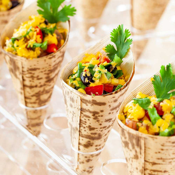 Streamline your plating, presentation, and serving with our stylish 5 Inch Bamboo Food Cones. These versatile bamboo cones provide convenient and sophisticated serving for passed appetizers, snacks, and finger foods at buffets, cocktail parties, and catered events. Bamboo is renowned for being a strong, durable, and nature-friendly resource -- making it the perfect material for manufacturing paper cones for foods. Plus, the beautiful brown and cream hues of our natural bamboo leaf cones perfectly complements a wide range of delectable tapas and treats. Each food cone measures 5 inches and holds 2.5 ounces. Each is shipped in bulk in a 50 count box.