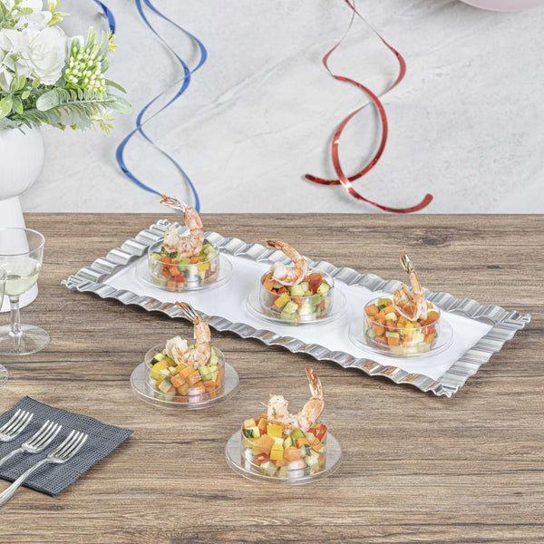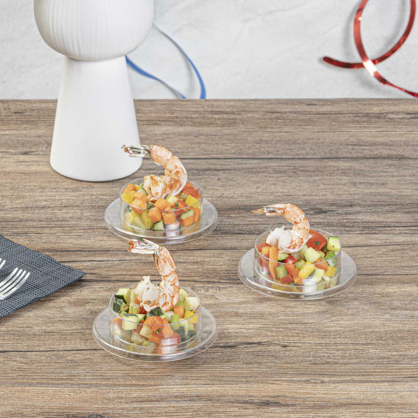 Give your delectable delights a chic makeover with our 3-ounce Round Clear Plastic Gastronomique Petri Dishes. Crafted from high-quality plastic, these serving dishes are durable and ideal for serving various wet, dry, and cold food items. These plastic dishes can hold up to 3 ounces and are perfect for serving small portions of amuse bouches and desserts. Featuring an innovative circular shape, these clear dishes elevate the look of your miniature appetizers, desserts, and hors d'oeuvres. The crystal clear finish of these disposable dishes ensures your guests can see every decadent layer of your sweet or savory treats. These dessert dishes are disposable to provide quick and easy post-event cleanup. Each round plate measures 3.25 inches in diameter by 1 inch and has a capacity of 3 ounces. Shipped in a 10 count box.