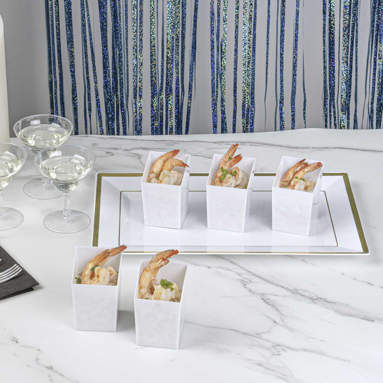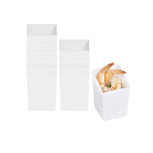 Easily display complex desserts in our Mini Serve 3-ounce Square White Plastic Incline Cups. These attractive white dessert cups have a sleek sloping edge that provides an elegant presentation for treats. The sturdy construction of these square incline cups allows for easy handling and passing around. These disposable appetizer cups are convenient for quick cleanup after any event. With a white finish, these plastic dessert cups for cold foods are perfect for serving condiments, nuts, candies, and more. The disposable design of these long dessert cups allows you to simply throw them away after use. Measuring 1.75 inches in length by 1.75 inches in width by 2.75 inches in height, these compact cups have a spacious 3-ounce capacity perfect for small portions. Sold in a 100 count box.