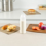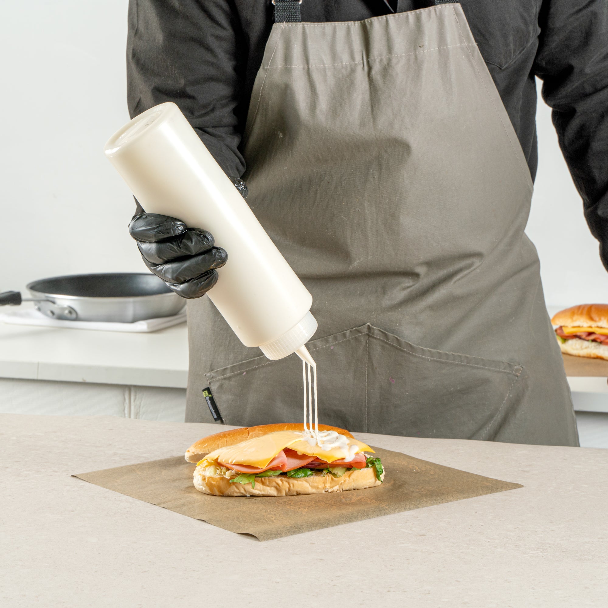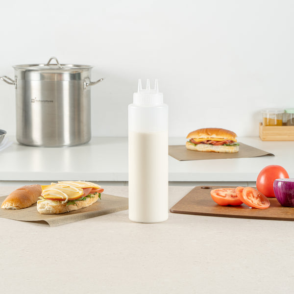 Improve your kitchen performance with our 32-ounce Clear Plastic All-Purpose Squeeze Bottle. This versatile squeeze dispenser is crafted from food-safe plastic, perfect for storing a variety of condiments. Equipped with a unique 3-tip design, this condiment dispenser ensures quick and even dispersion of oils on grills or sauces on sandwiches for consistent flavor with every use. Featuring a clear finish, this refillable squeeze bottle showcases the vibrant colors of the condiments, adding an appealing aesthetic to your prep stations. With a generous capacity of 32 ounces, this sauce bottle measures 3.07 inches in diameter by 10.83 inches in height, providing ample space for your favorite sauces or dressings. Sold in a 6 count box.