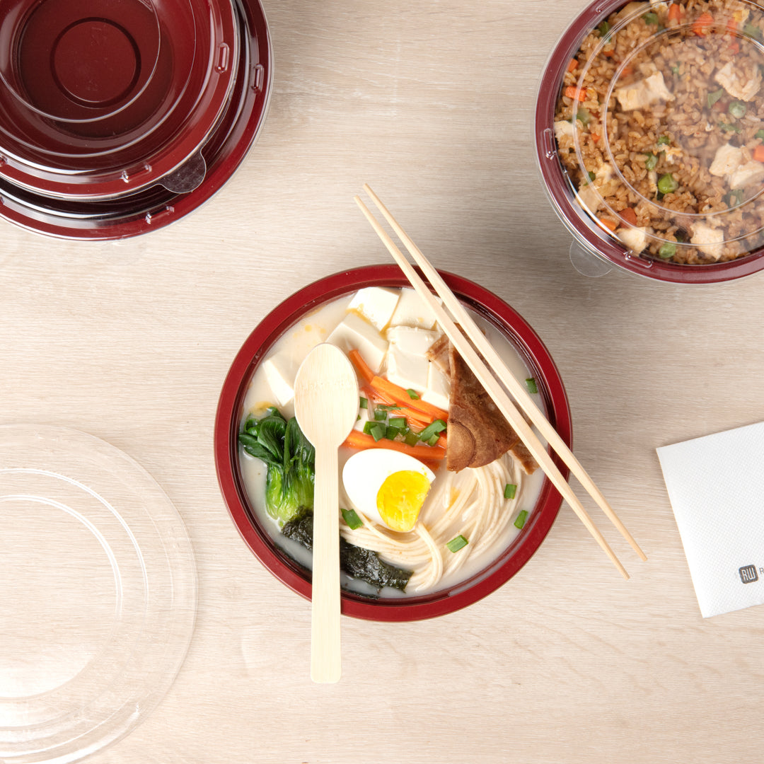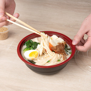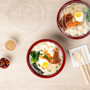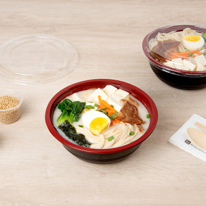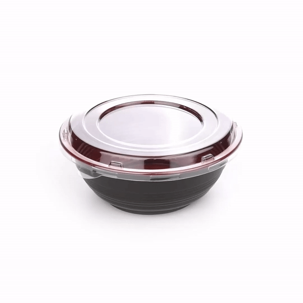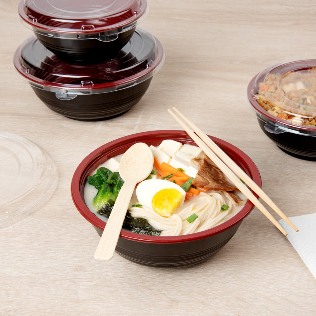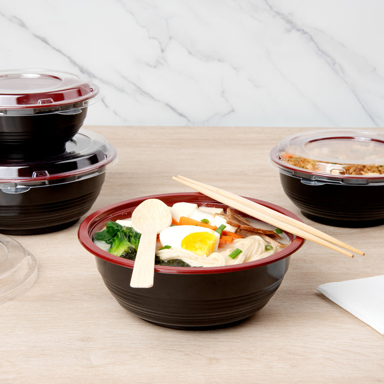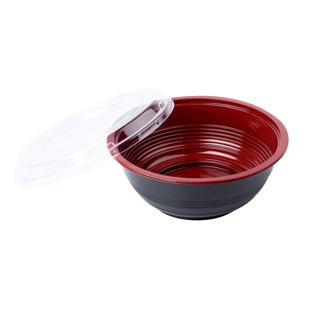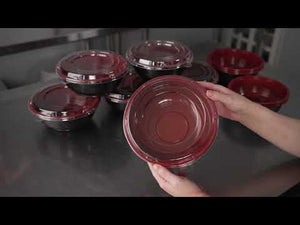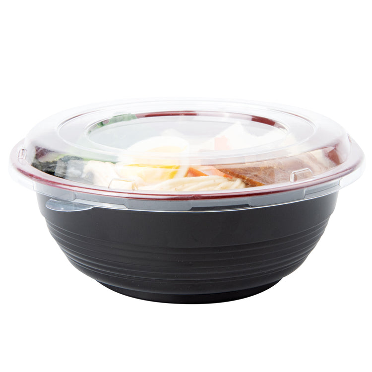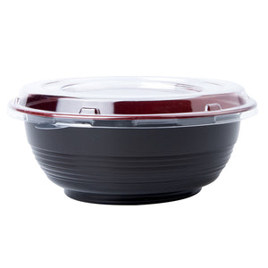 Present your delicious fares with elegance using our Tamper Tek 34-ounce Round Black and Red Plastic Large Asian Panda Bowls. Constructed from high-quality plastic for unwavering sturdiness, these to go bowls are suitable for packing a wide range of hot and cold foods. These food containers can hold up to 34 ounces and offer ample space, making them well-suited for larger servings, main courses, or family-sized portions. The contrast between the sleek black exterior and the vivid red interior of these meal prep containers lends a touch of contemporary flair to your table settings. These round bowls come with clear plastic lids that form a snug fit to ensure a leakproof take out experience. For a simple post-meal cleanup, these plastic bowls with lids are disposable. These disposable bowls are microwave-safe and offer the convenience of reheating meals without having to switch containers. Measuring 7.25 inches in diameter by 2.75 inches in height, these large bowls can hold up to 34 ounces. Shipped in a 200 count box. Note: Lids are not for microwave use.