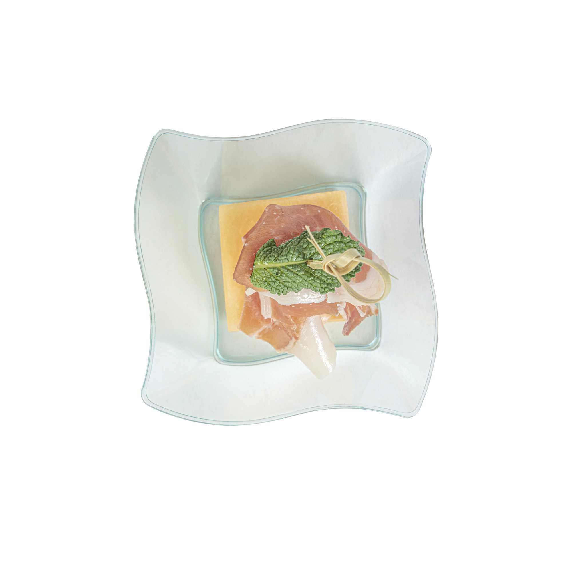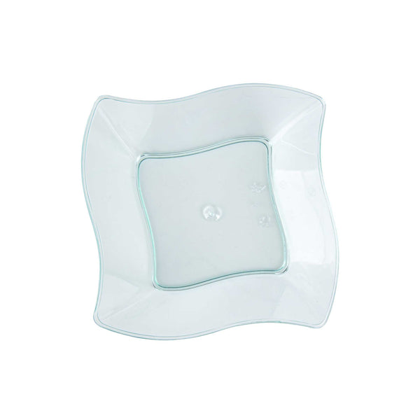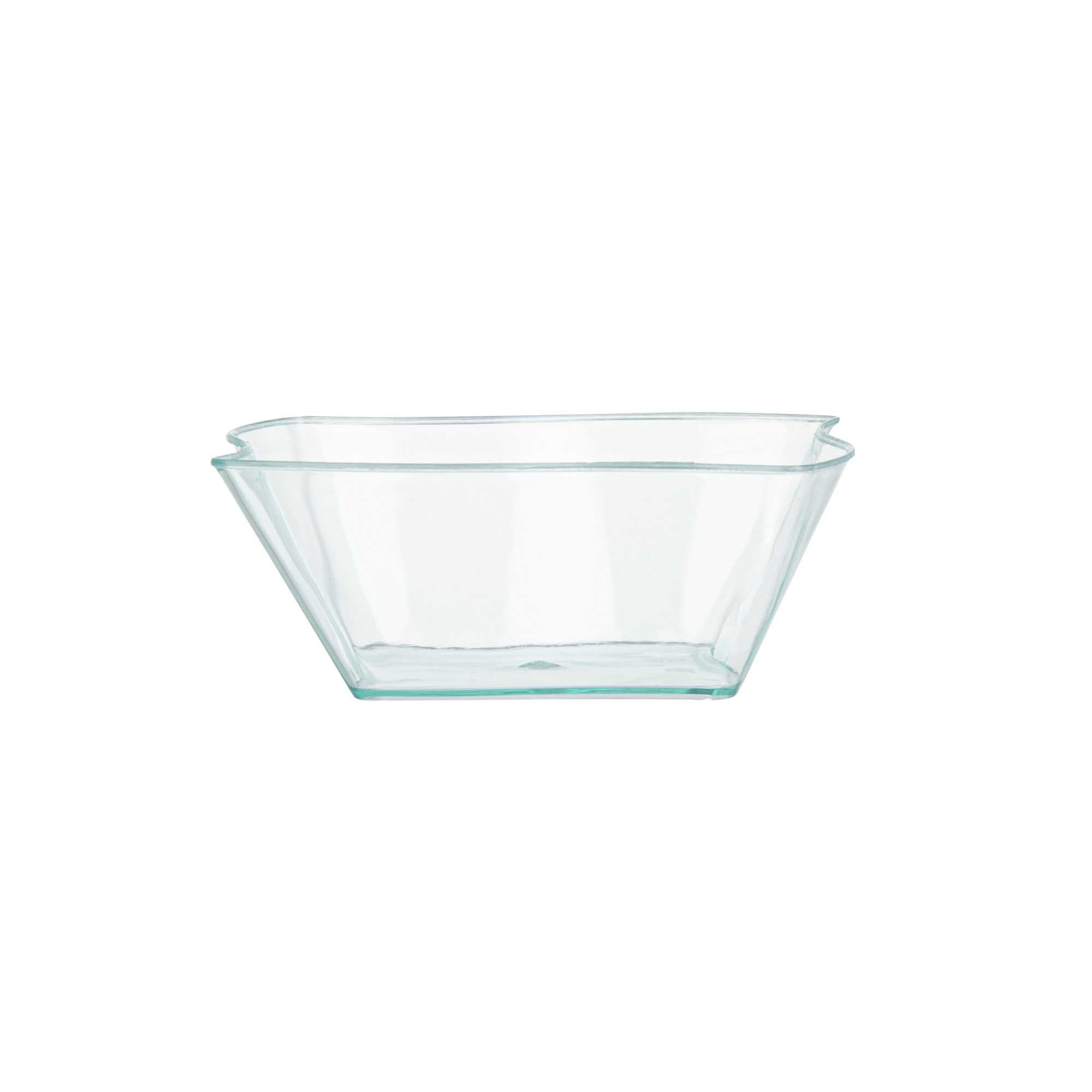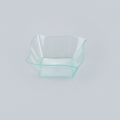 Dazzle your guests with miniature appetizers and hors d'oeuvres in our 6-ounce Square Seagreen Plastic Aqua Bowls. Featuring a unique curved design, these contemporary appetizer cups bring a memorable touch to cocktail parties, banquets, or other catering events. Use these plastic dessert cups as a conveniently portable and mess-free way to serve small portions of creamy polenta and slow-braised short ribs or to stylishly serve miniature chocolate souffles and fruit compotes. With a disposable feature, these plastic bowls make cleaning easy. Designed with a lovely seagreen tint, these small, clear plastic bowls are sure to be a hit at your next event. These 6-ounce plastic bowls measure 3.25 inches in length by 3.25 inches in width by 1.5 inches in height. Sold in a 25 count box.