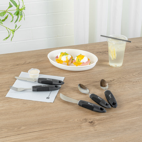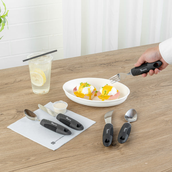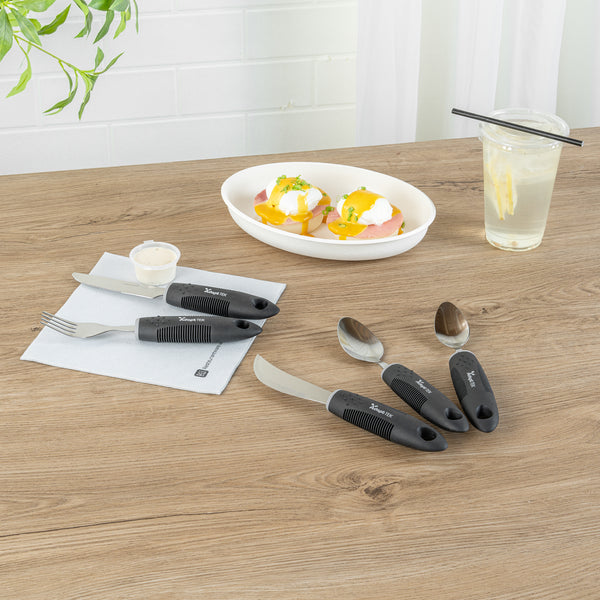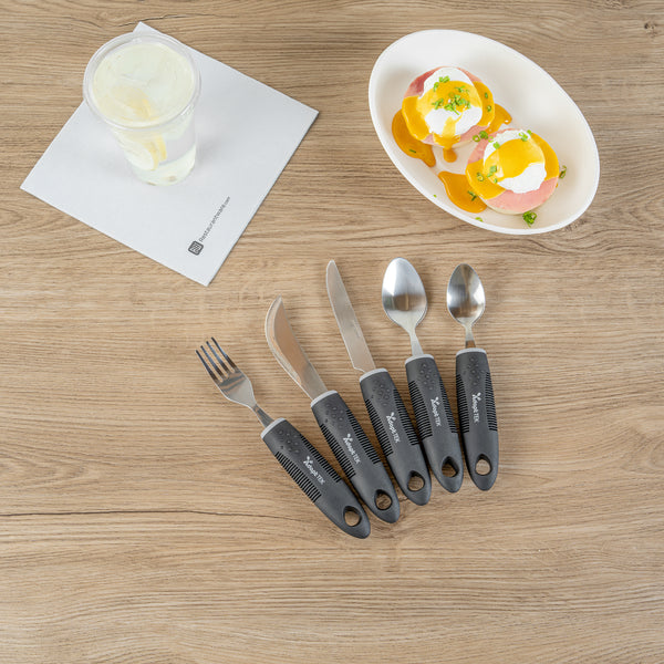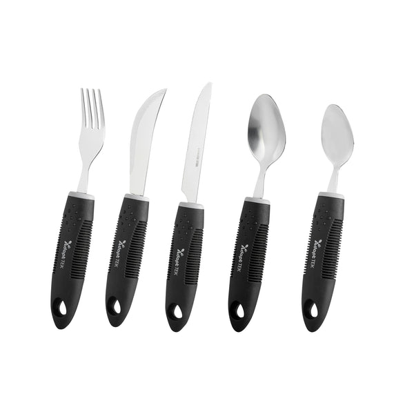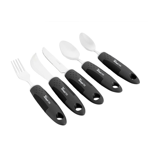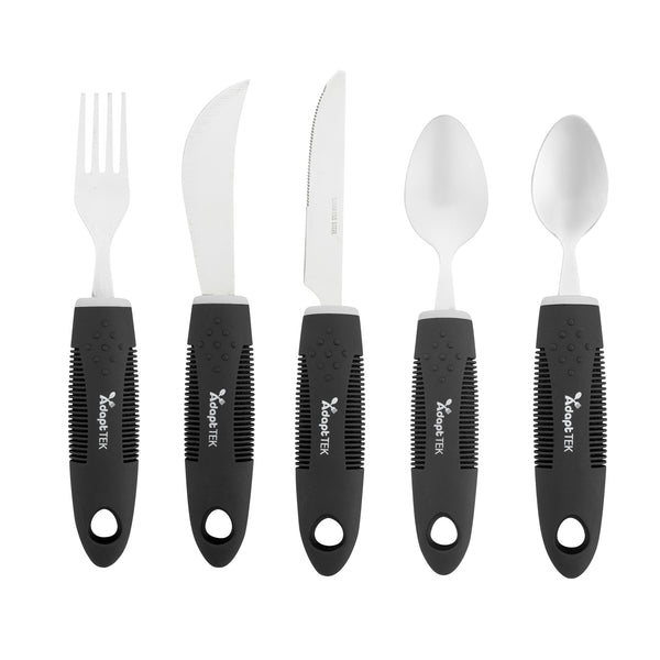 Enhance dining experiences with utensils that empower independence. Adapt Tek Non-Slip Stainless Steel Adaptive Kitchen Utensils feature a non-weighted design, providing effortless control and reducing strain for users with weak grip or tremors. This adaptive kitchen utensils set includes a non-slip surface, ensuring stability during service and making it ideal for healthcare institutions and assisted living facilities. Constructed from durable stainless steel, these utensils are suitable for both hot and cold food applications, including freezer-safe use. The secure-grip design prevents accidental spills and drops, supporting individuals with limited dexterity, while the dishwasher-safe feature simplifies cleanup in busy foodservice settings. With dimensions of 9.84 inches in length, 5.12 inches in width, and 1.58 inches in height, this non-slip cutlery set provides the right tool for every meal. Equip your establishment with this reliable spoon fork knife set to enhance operational efficiency and dining satisfaction. Each order includes 1 Adapt Tek Non-Slip Stainless Steel Adaptive Kitchen Utensils.