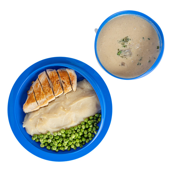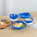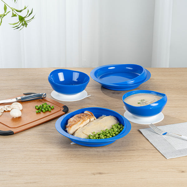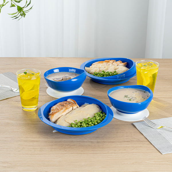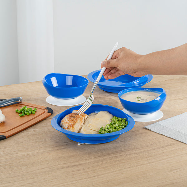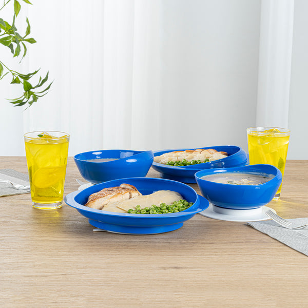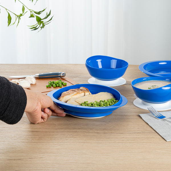 Enhance dining independence with spill-proof design. The Adapt Tek Adaptive Scoop Bowl and Plate Set features an anti-skid rubber suction bottom that prevents accidental spills, ensuring stability during meals on various surfaces. Its high-to-low rim design aids in scooping food effortlessly, making it the ideal adaptive scoop bowl for users with limited dexterity. With deep sides and a wide rim, this bowl encourages one-handed self-feeding, reducing food spills and promoting independence for individuals in rehabilitation centers or home care settings. Crafted from safe, food-grade plastic, it is microwave, freezer, and dishwasher safe, providing convenience and durability. The bowl's non-slip dining plate design supports assisted living facilities in offering reliable dining solutions to residents. Invest in adaptive dining tools to foster self-reliance and confidence in meal times. Each order includes 1 Adapt Tek Adaptive Scoop Plate and Bowl Set.