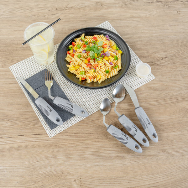 Enhance dining independence with customizable utensil solutions. The Adapt Tek Adaptive Bendability Utensils Set features a bendable design allowing up to 90 degrees of adjustment, ensuring these adaptive utensils set meet the needs of individuals with limited hand mobility. Constructed from durable stainless steel 410, these assistive eating utensils are lightweight yet robust, providing effortless control for users with weak grip or tremors. The non-slip TPR handles, measuring 9.84 inches in length, ensure a secure grip, while a unique "foot" design keeps utensils raised off surfaces, promoting better hygiene. Freezer-safe capabilities make these utensils ideal for cold storage needs, and their bendable structure accommodates varying dish shapes, making them perfect utensils for tremors. Whether in assisted living facilities, rehabilitation centers, or home care settings, these utensils provide a complete dining solution. Each order includes 1 Adapt Tek Adaptive Bendability Utensils Set.