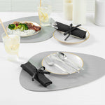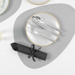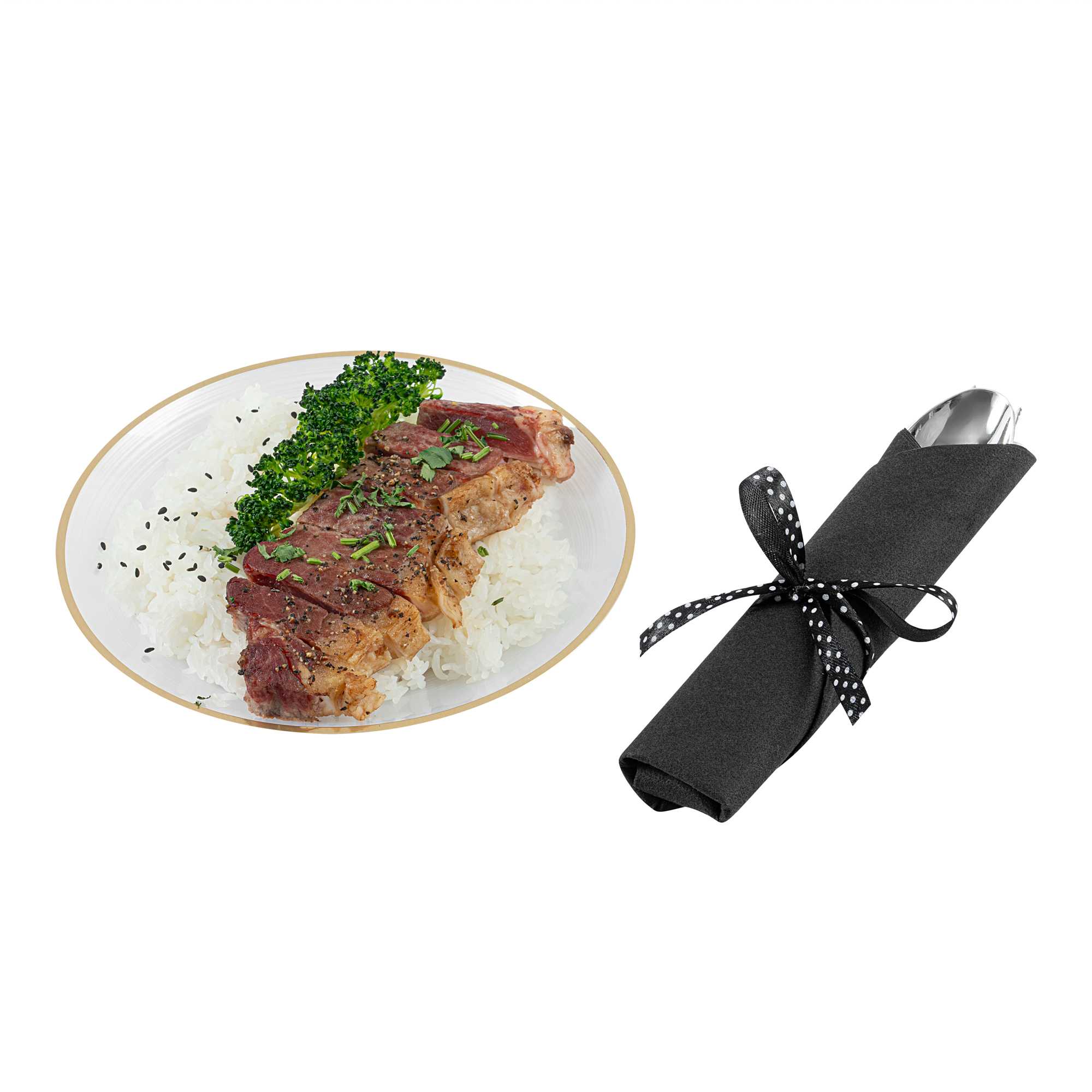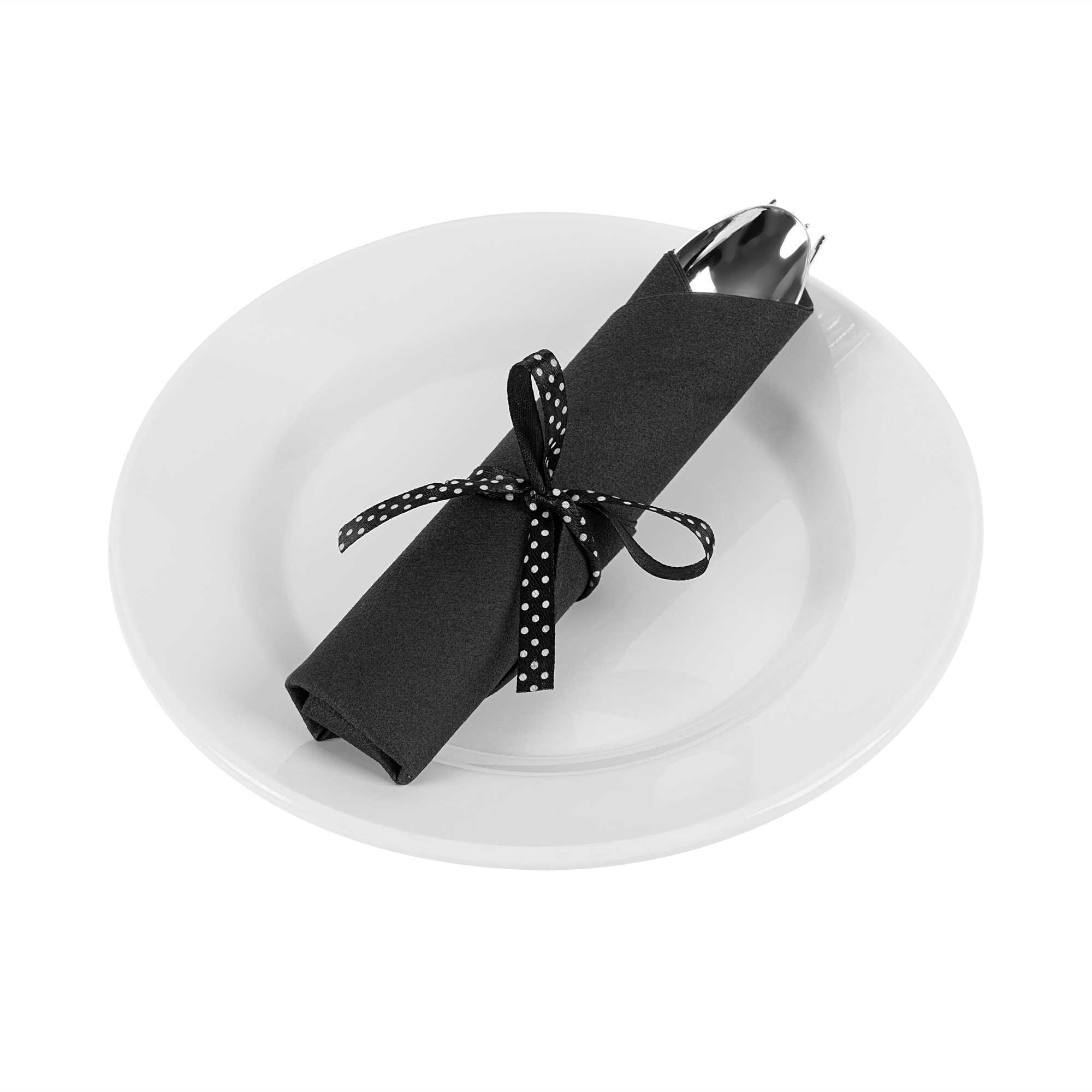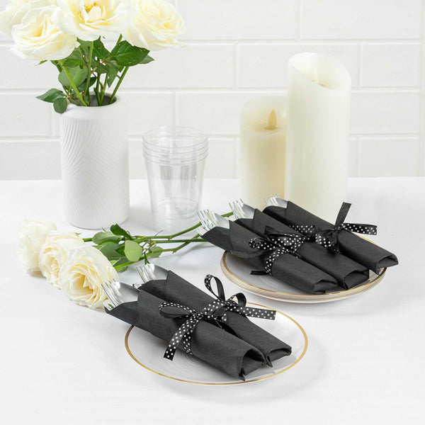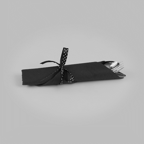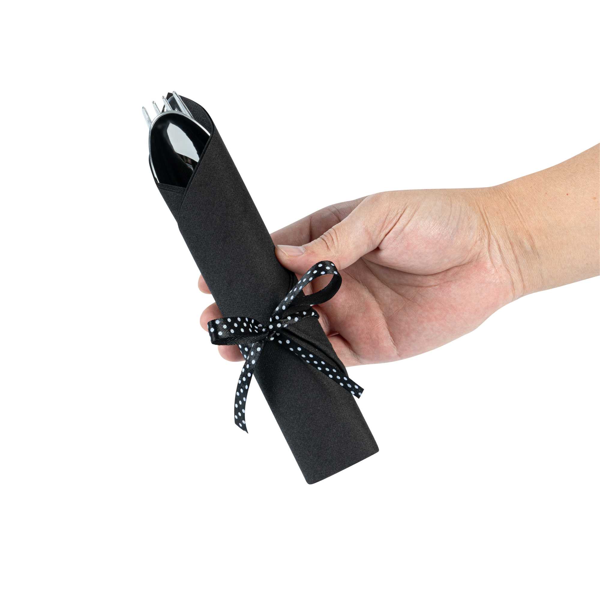 SILVER PLASTIC CUTLERY SET - WITH BLACK NAPKIN, POLKA DOT RIBBON