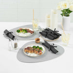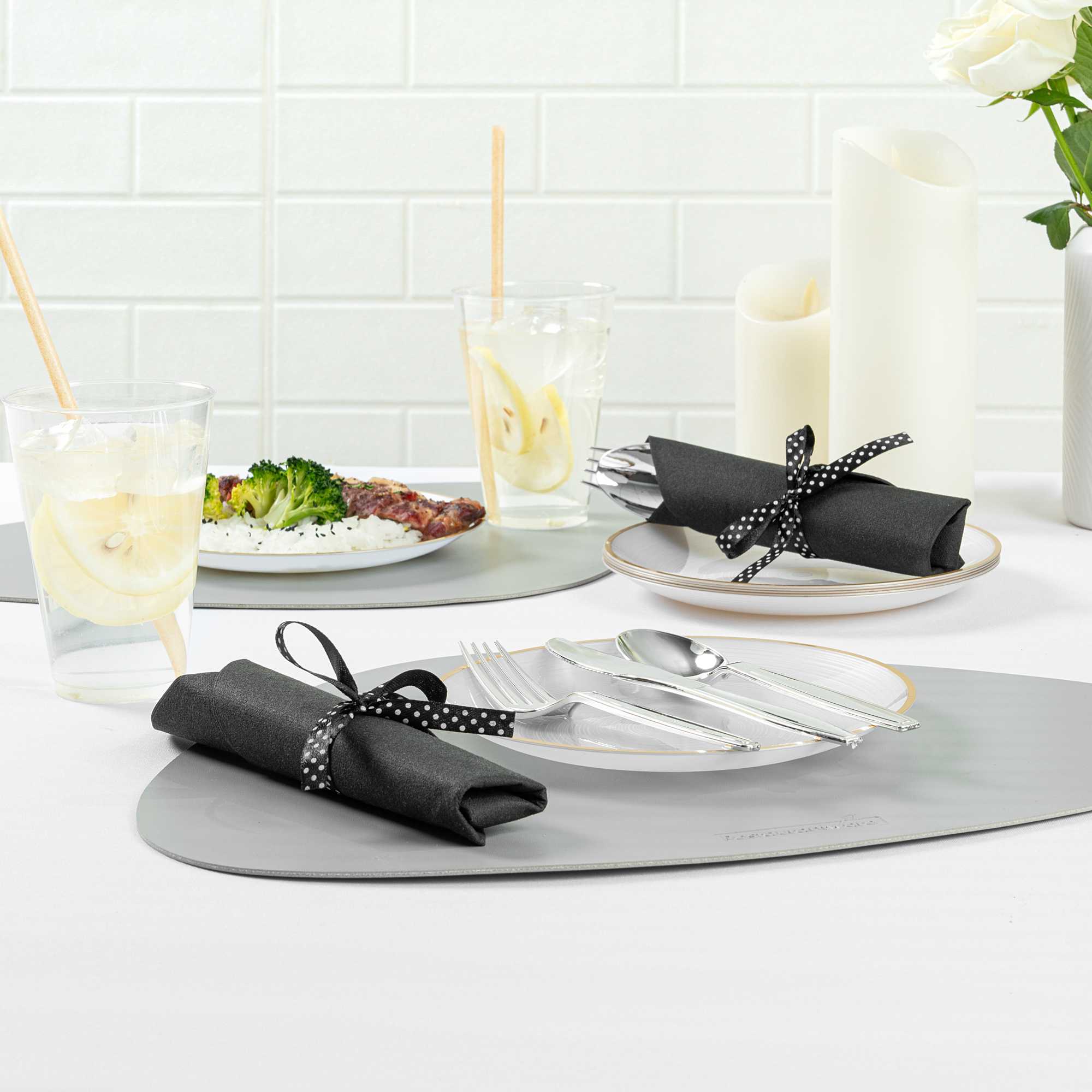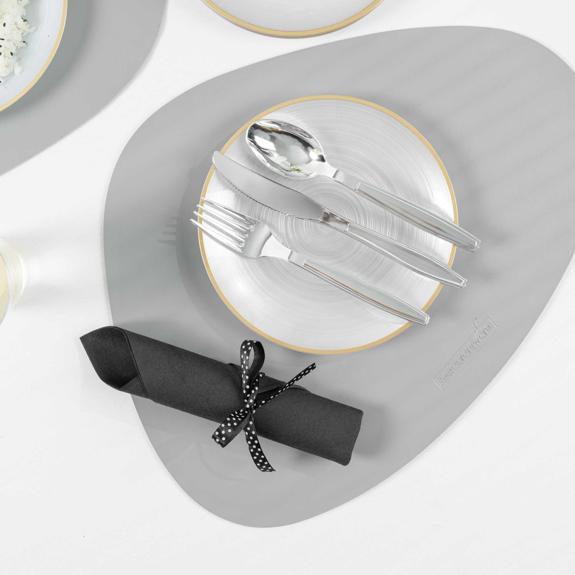 Streamline your event cleanup with recyclable cutlery. The Argento Recyclable Disposable Cutlery Set enhances your catering operations with its high-quality plastic construction, ensuring a hassle-free post-event cleanup. Designed as a multipurpose plastic flatware set, it is ideal for serving cold, dry, and wet foods, making it versatile for various dining settings. Each pre-rolled cutlery set comes with a napkin, elegantly tied with a charming polka-dotted ribbon, boosting the presentation of your table settings. Measuring 7.25 inches in length, 2 inches in width, and 1.75 inches in height, these silver cutlery sets add a touch of sophistication to any occasion while simplifying foodservice operations. Elevate your dining experience with this sustainable choice and ensure your event runs smoothly with this disposable cutlery set. Each order includes 100 Argento Recyclable Disposable Cutlery Sets.