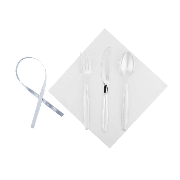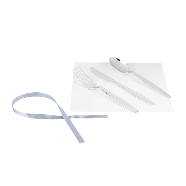 SILVER PLASTIC CUTLERY SET - WITH WHITE NAPKIN, SILVER RIBBON