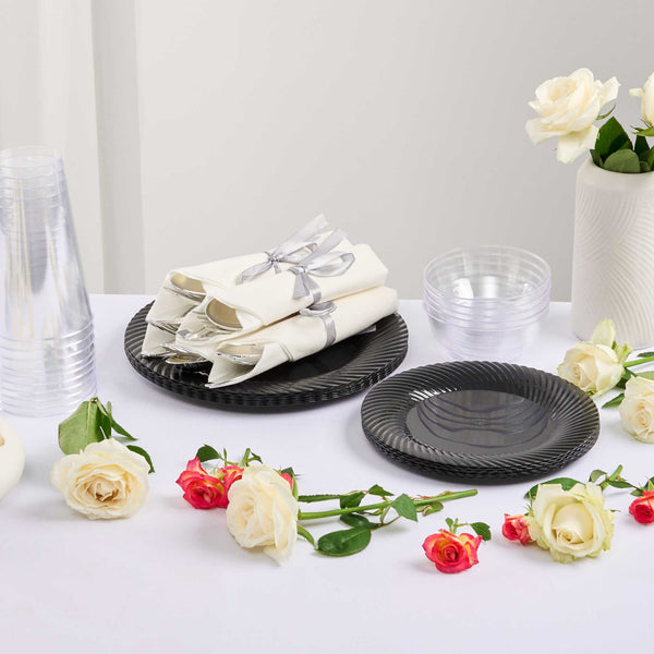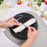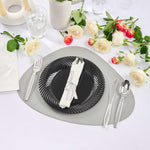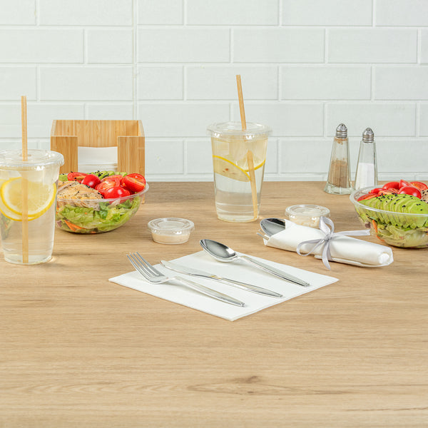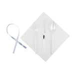 Get functional and beautiful flatware all-in-one with our Argento Silver Plastic Cutlery Sets. Featuring a spoon, fork, and knife wrapped with a napkin and ribbon in each set, these plastic utensils are ideal for coordinating with any delicious dish. Crafted from premium plastic, this plastic silverware is disposable and provides quick and easy post-event cleanup. Each plastic cutlery set is tied with a charming black and white polka dot ribbon to effortlessly complement the décor of your café, bistro, or catering event. The recyclable feature of these clear plastic utensil sets actively reduces your carbon footprint. With their durable construction, these disposable cutlery sets do not bend or break easily. Packaged with a high-quality napkin, these sturdy plastic dining sets allow guests to enjoy their food while avoiding messes. The plastic silverware in each set measures 7.25 inches long by 2 inches wide. Shipped in a 100 count box.