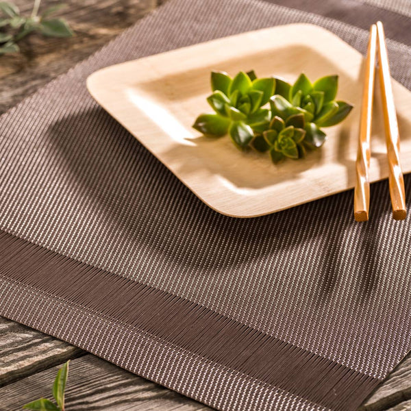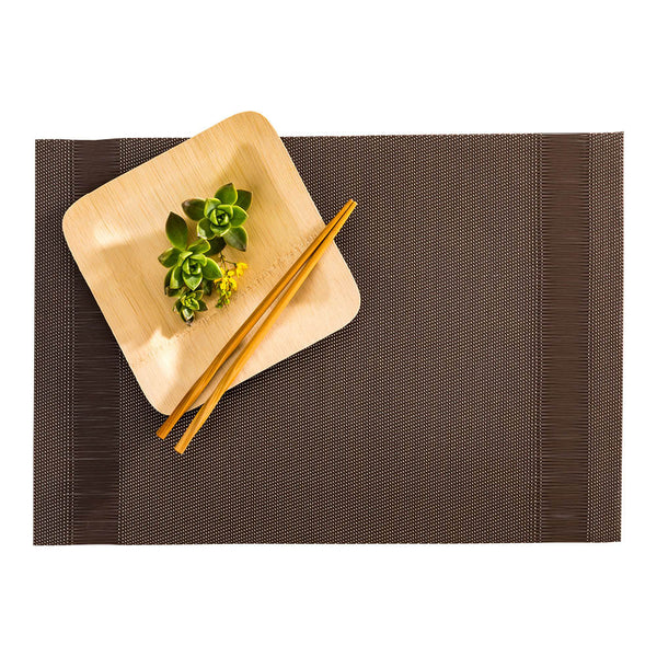 Transform your tabletops with these unique and rustic-inspired Brown Artisan Stripe Woven Vinyl Placemats. Combining a rich chocolatey color with a finely woven vinyl design, these brown placemats are an elegant addition to any restaurant or foodservice establishment. Their dynamic woven pattern adds a polished touch to any occasion, while their durable vinyl construction easily protects tables and linens from stains and messes. Designed with two eye-catching stripes of exposed threads, these rustic placemats are sure to impress your guests. Each of these unique placemats measures 12 inches in width by 16 inches in length. Ideal for restaurants, cafes, and catering companies, these reusable vinyl placemats make it easy to reset tables after service. To ensure sanitary post-meal cleanup, simply wipe each placemat with soap and water before reusing. Sold in a 6 count box. Due to the woven design of these placemats, there may be slight color variations.