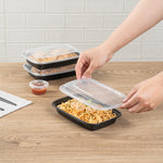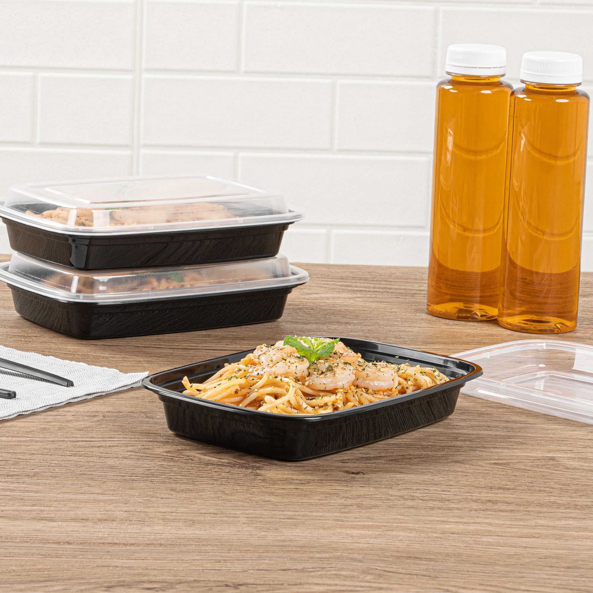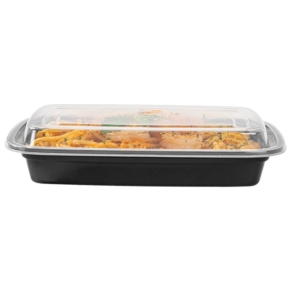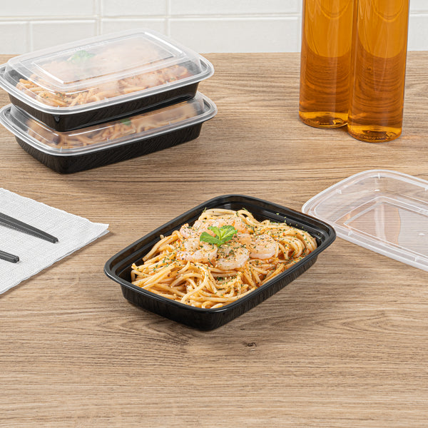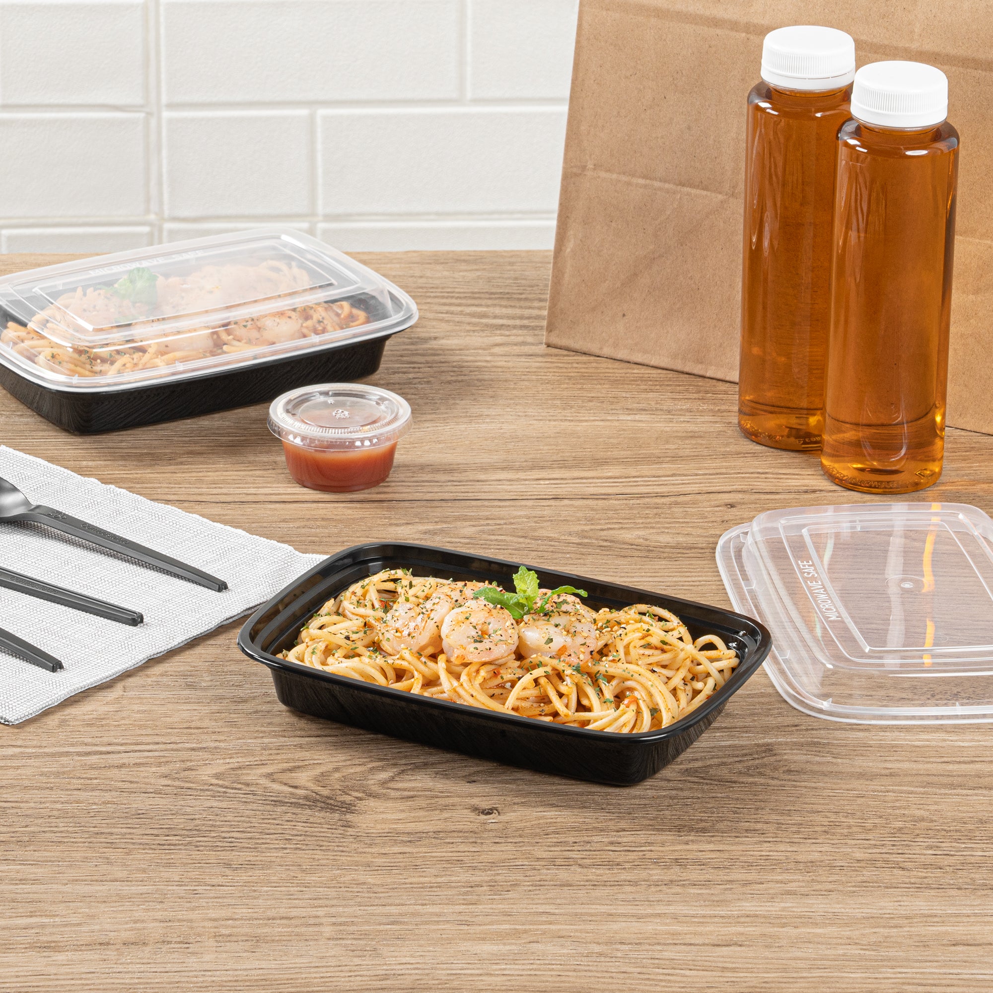 Efficiently manage your meal prep with versatile storage solutions. The Asporto Black Plastic Food Container with a Clear Lid provides an unobstructed view of your packed meals, ensuring easy identification and presentation. This plastic food container is BPA-free and features a microwave-safe design, allowing you to conveniently reheat your meals without transferring them to another dish. Its sturdy construction supports various hot and cold food options, making it ideal for both meal prep and foodservice operations. Measuring 7.7 inches in length, 5.5 inches in width, and 1.5 inches in height, this container offers a 16-ounce capacity, perfectly sized for portion control and efficient storage. Additionally, its recyclable material promotes sustainability, catering to environmentally-conscious establishments. Each order includes 50 Asporto Black Plastic Food Containers with Clear Lids.