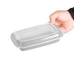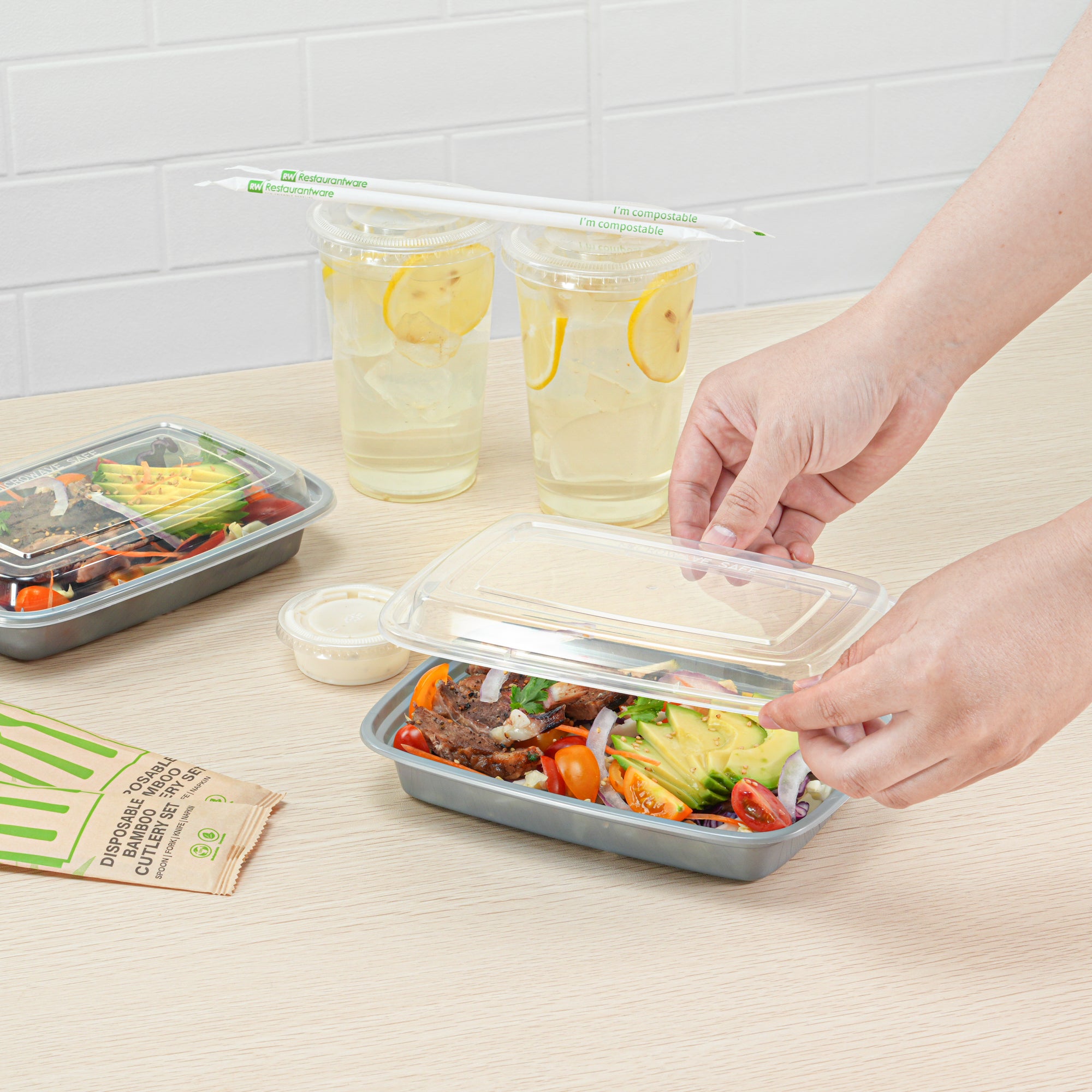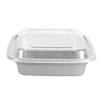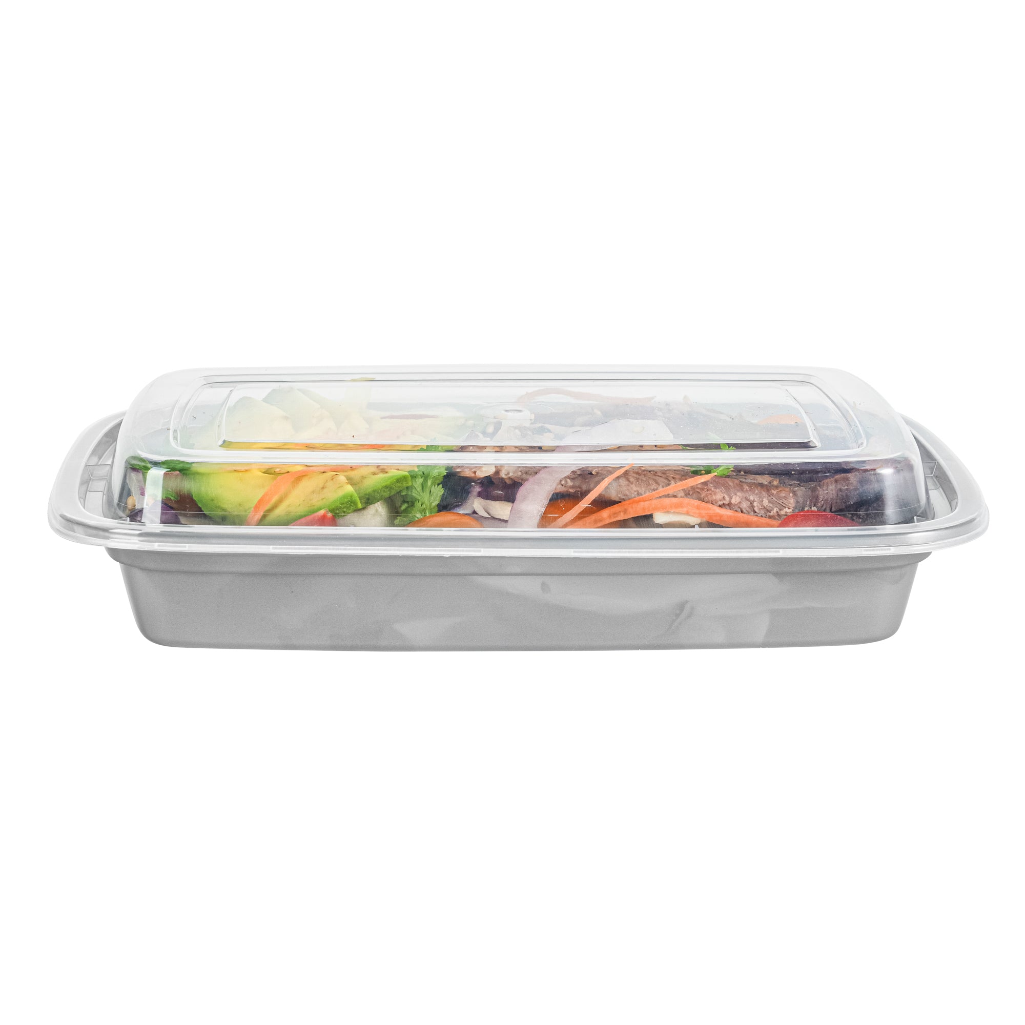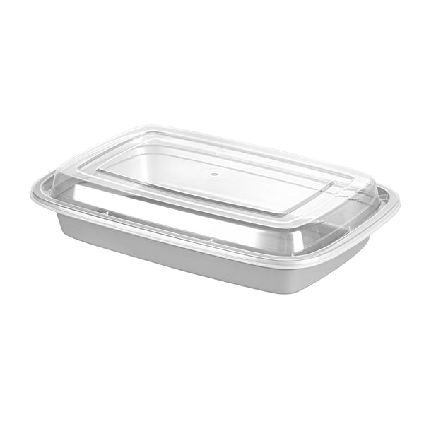 Enhance your food delivery service with our Asporto 16-ounce Rectangle Silver Plastic To Go Boxes. Featuring clear lids, these to go boxes form a tight-fitting seal to prevent spills and messes during transport. Designed to be microwave-safe, these meal prep containers conveniently heat food without switching to a different container. These takeaway boxes are made from BPA-free plastic and boast premium durability, ideal for packing various hot and cold food items. The sleek silver finish of these carry out containers accentuates the look of your take out and delivery orders. These disposable food containers can be discarded after use and facilitate an easy post-meal cleanup. Ideal for eco-conscious foodservice establishments, these to go containers are recyclable. Measuring 7.75 inches in length by 5.5 inches in width by 1.5 inches in height, these take out containers have a capacity of 16 ounces and offer ample space for your culinary creations. Sold in a 100 count box.