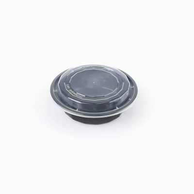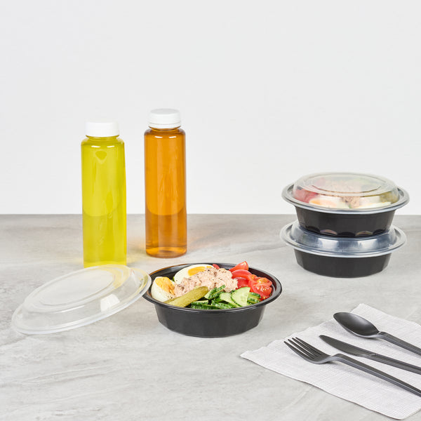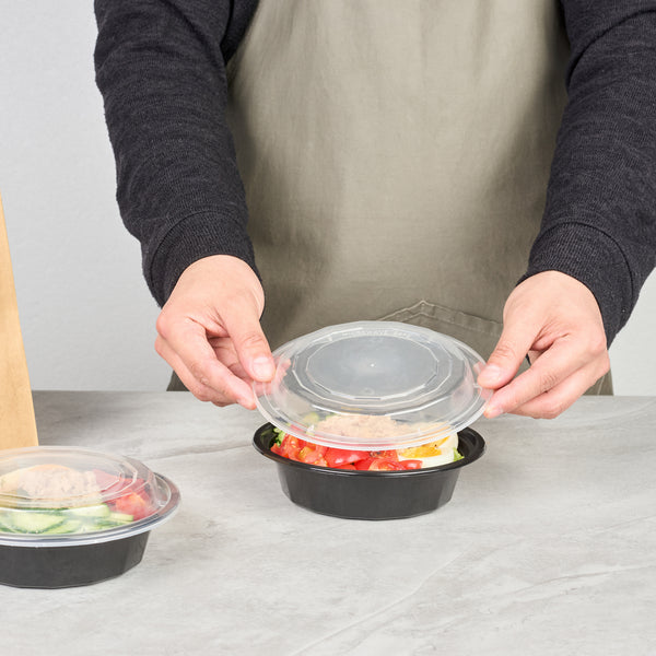Make it simple to serve food to go with our Asporto 16-ounce Round Black Plastic To Go Boxes. Created from polypropylene plastic, these food take out containers are BPA-free and heat-resistant, making them perfect for serving a wide range of food items. These round food containers come with a clear plastic lid that forms a tight-fitting seal to take you food on the go. The durable plastic construction of these plastic to go boxes ensures they can withstand the weight of hefty portions of food. Holding up to 16 ounces, these black take out boxes are perfect for serving noodles, salads, or pastas. Microwave-safe, these black food containers allow customers to reheat their meals easily. These disposable food boxes are recyclable to facilitate an environmentally friendly cleaning experience. The chic black finish of these microwavable food containers beautifully accentuates the look of your meal. Each disposable carry out containers measures 6.25 inches in diameter by 1.75 inches in height and have a capacity of 16 ounces. Sold in a 100 count box.