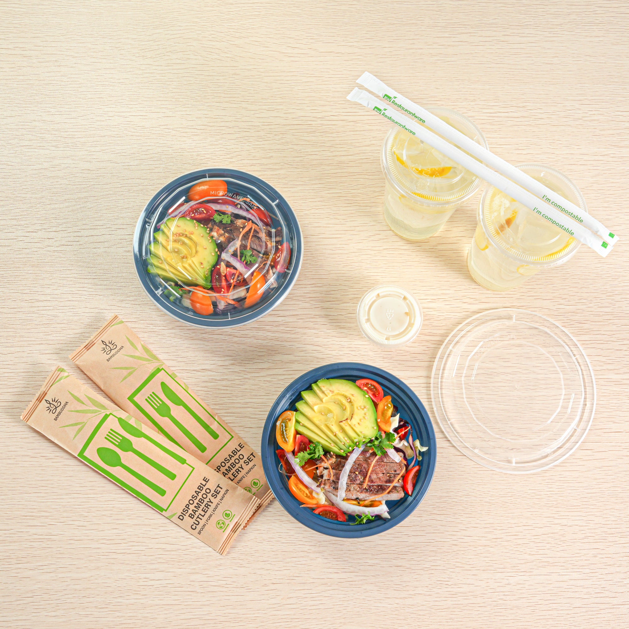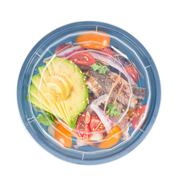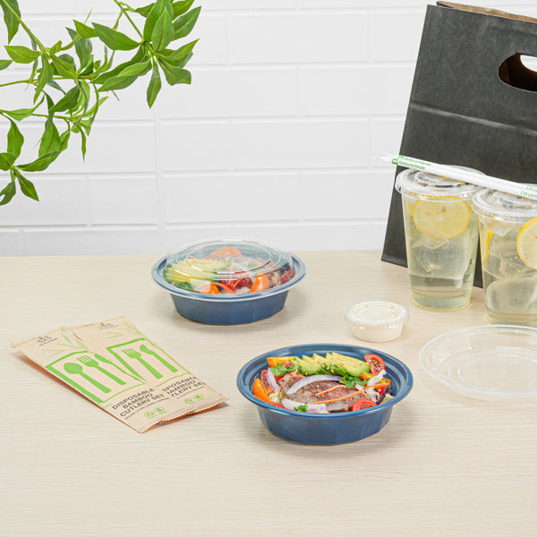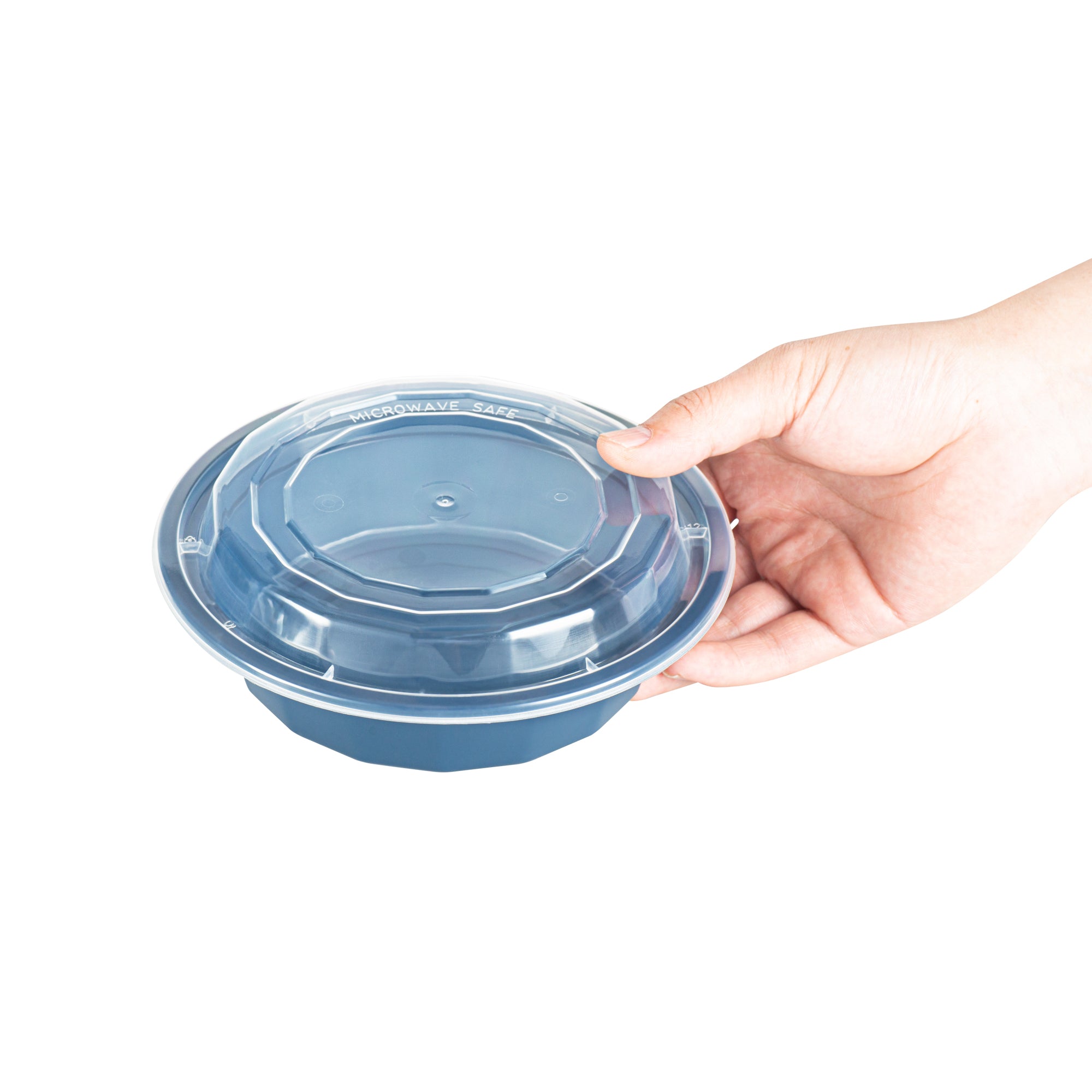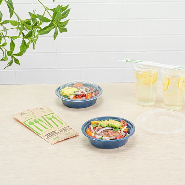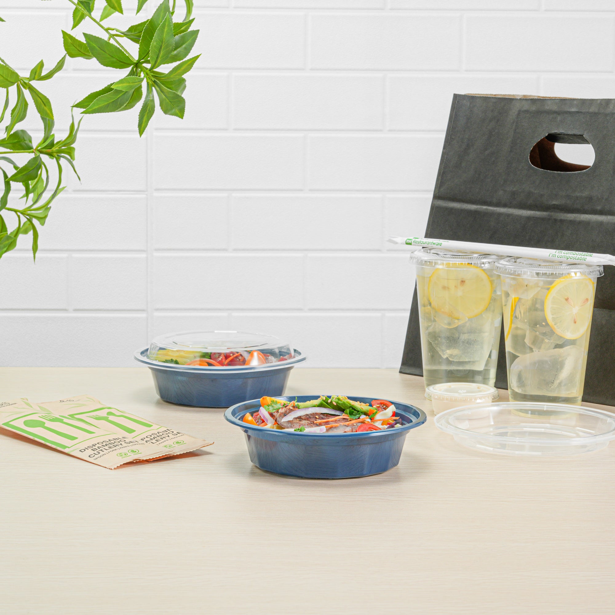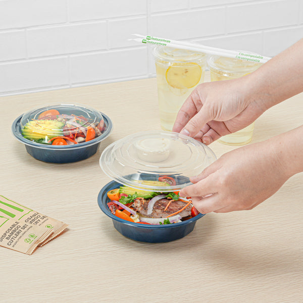 Elevate your foodservice presentation with our Asporto 16-ounce Round Midnight Blue Plastic To Go Boxes. The clear plastic lids of these carry out containers form a tight-fitting seal and prevent spills in transit. These meal prep containers are microwave-safe to let you easily reheat meals without transferring them to a different container. Crafted from BPA-free plastic, these takeaway boxes are durable and suitable for packing a wide variety of hot and cold food items. These to go boxes have a sophisticated midnight blue finish and add a stylish touch to any meal. To provide a hassle-free cleaning experience, these disposable take out boxes can be discarded after use. These to go containers are recyclable and ideal for providing customers with sustainable food packaging options. Measuring 6.25 inches in diameter by 1.75 inches in height, these take out containers can hold up to 16 ounces and offer ample space for packing your signature meals. Sold in a 100 count box.