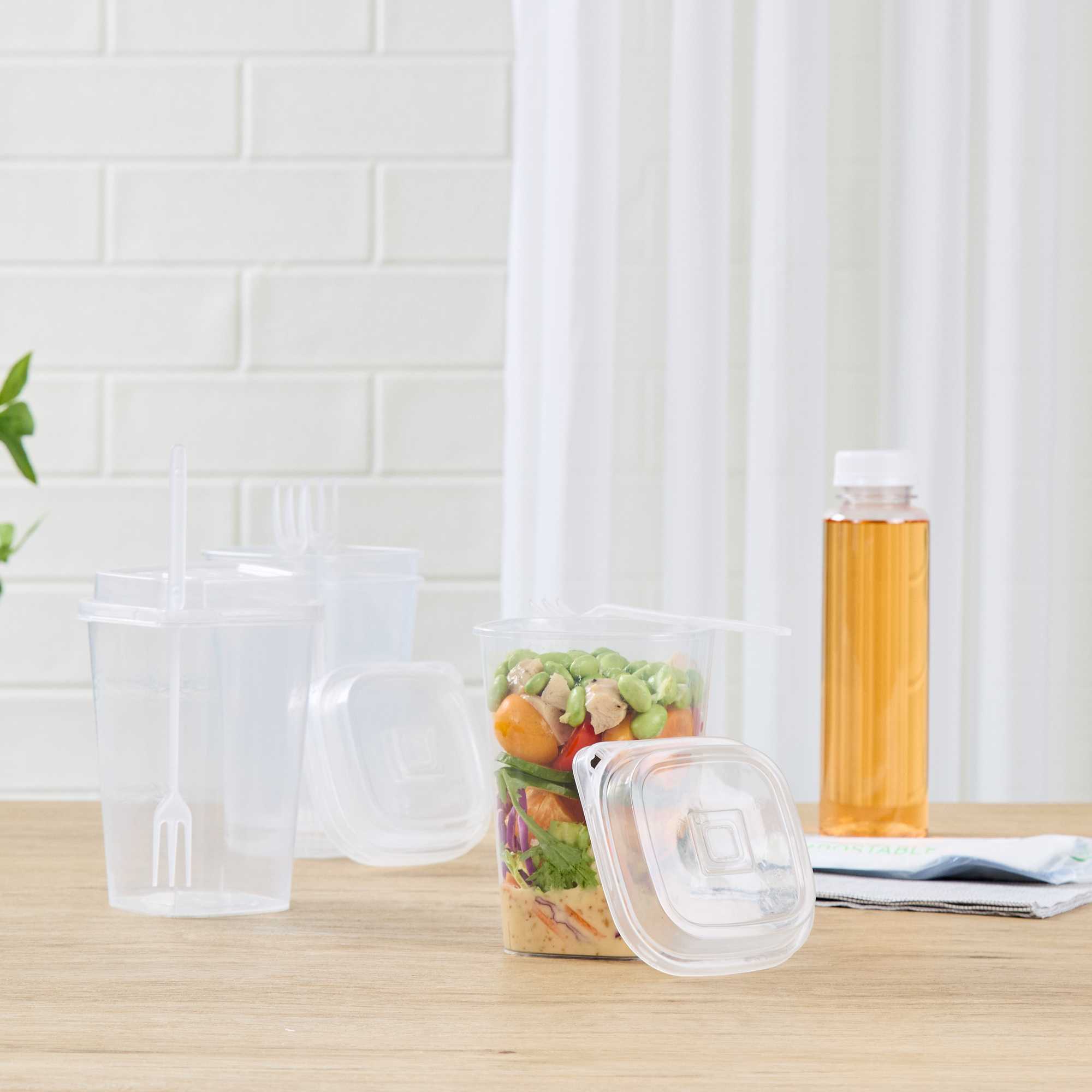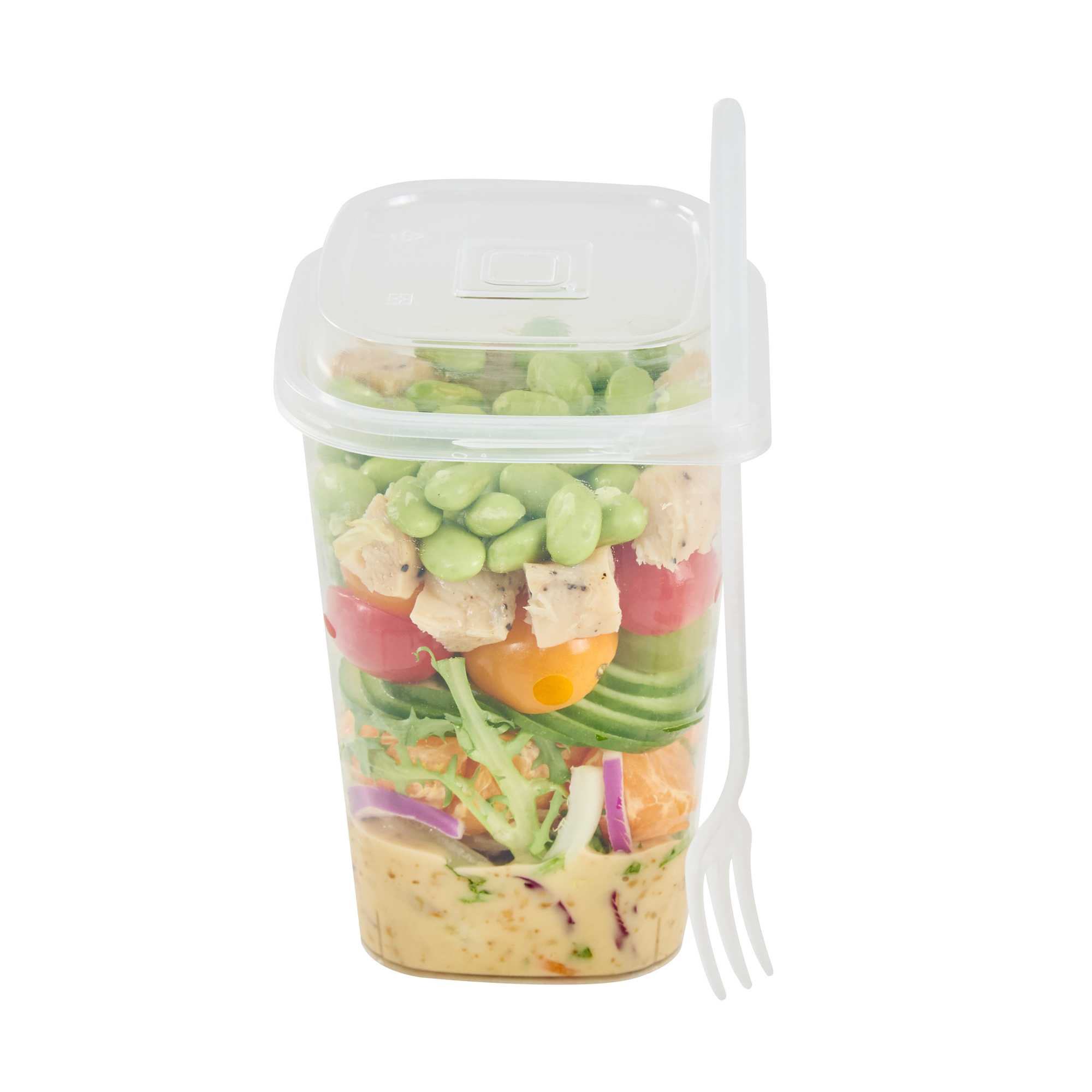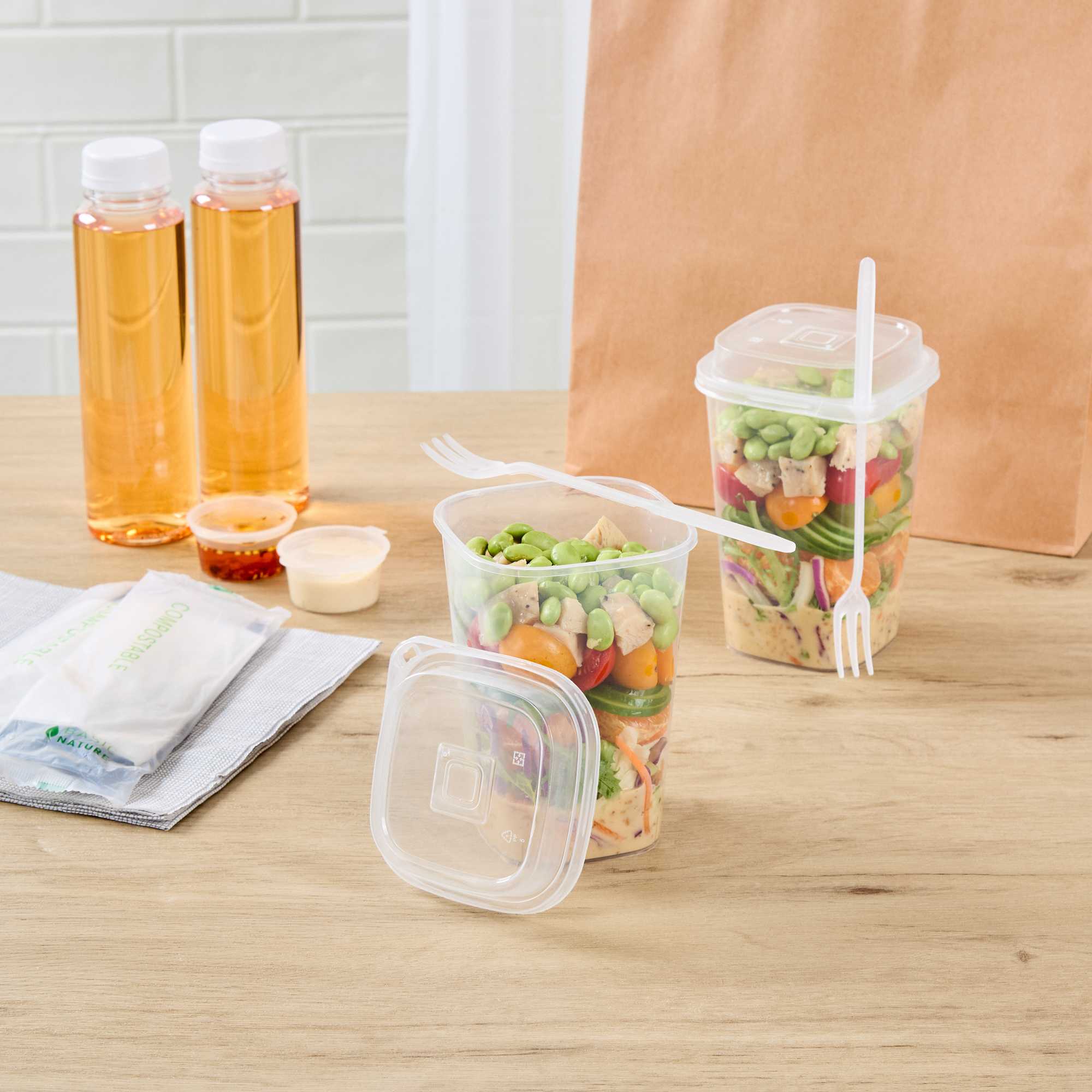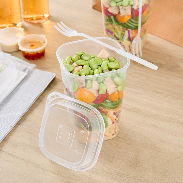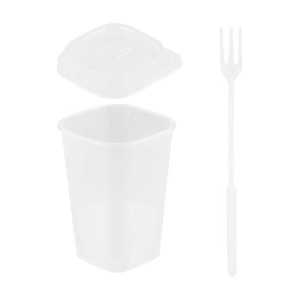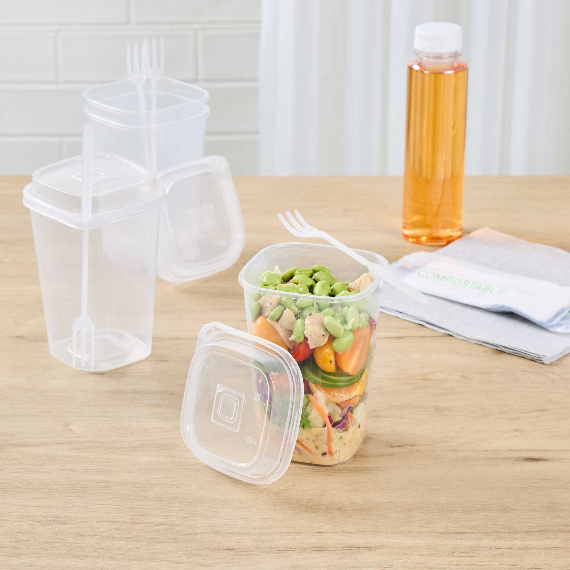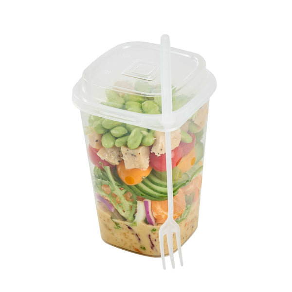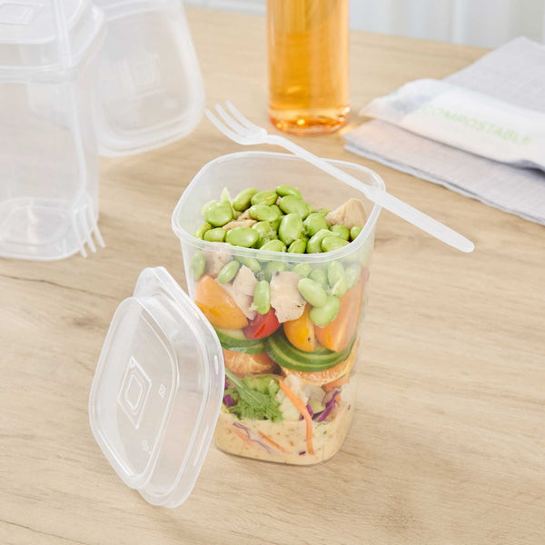 Prevent spills with a hassle-free meal prep solution. The Asporto Leakproof Plastic Food Container ensures easy transportation with its tight-sealing lid, making it an ideal plastic food container for busy foodservice settings. Engineered from plastic, this container is cold food-friendly, offering a sustainable option for your packaging needs. The included fork provides added convenience for customers enjoying salads and snacks on the go. With dimensions of 2.76 inches in length and width, and a height of 5.71 inches, these containers are perfect as meal prep containers for storing pre-portioned meals. Their clear design allows easy identification of contents, enhancing kitchen efficiency. Elevate your foodservice operation with this disposable container with a fork to offer customers a seamless dining experience. Each order includes 100 Asporto Leakproof Plastic Food Containers.