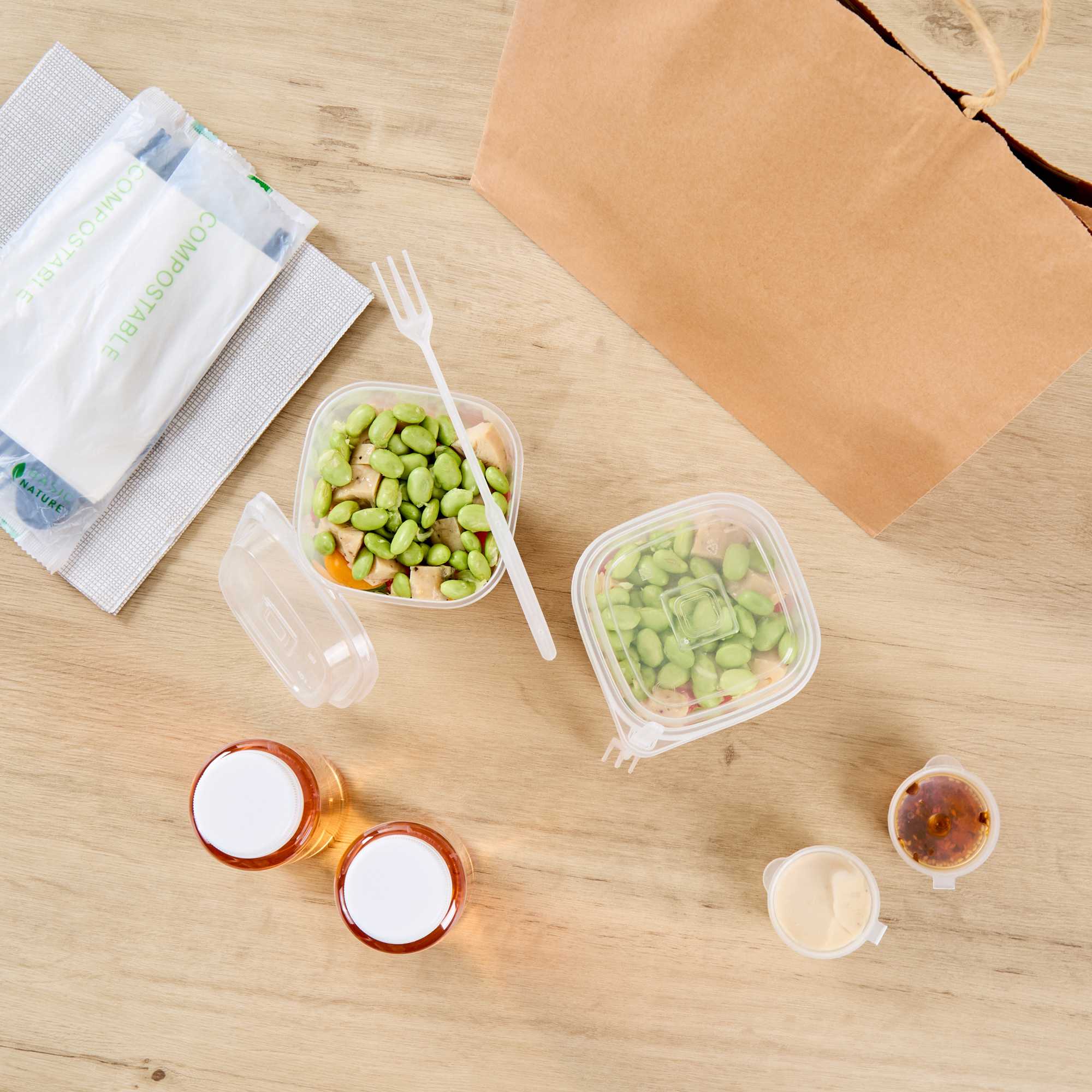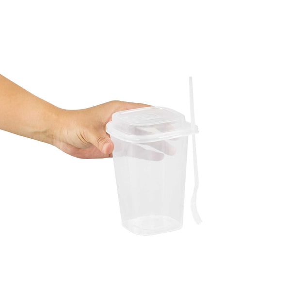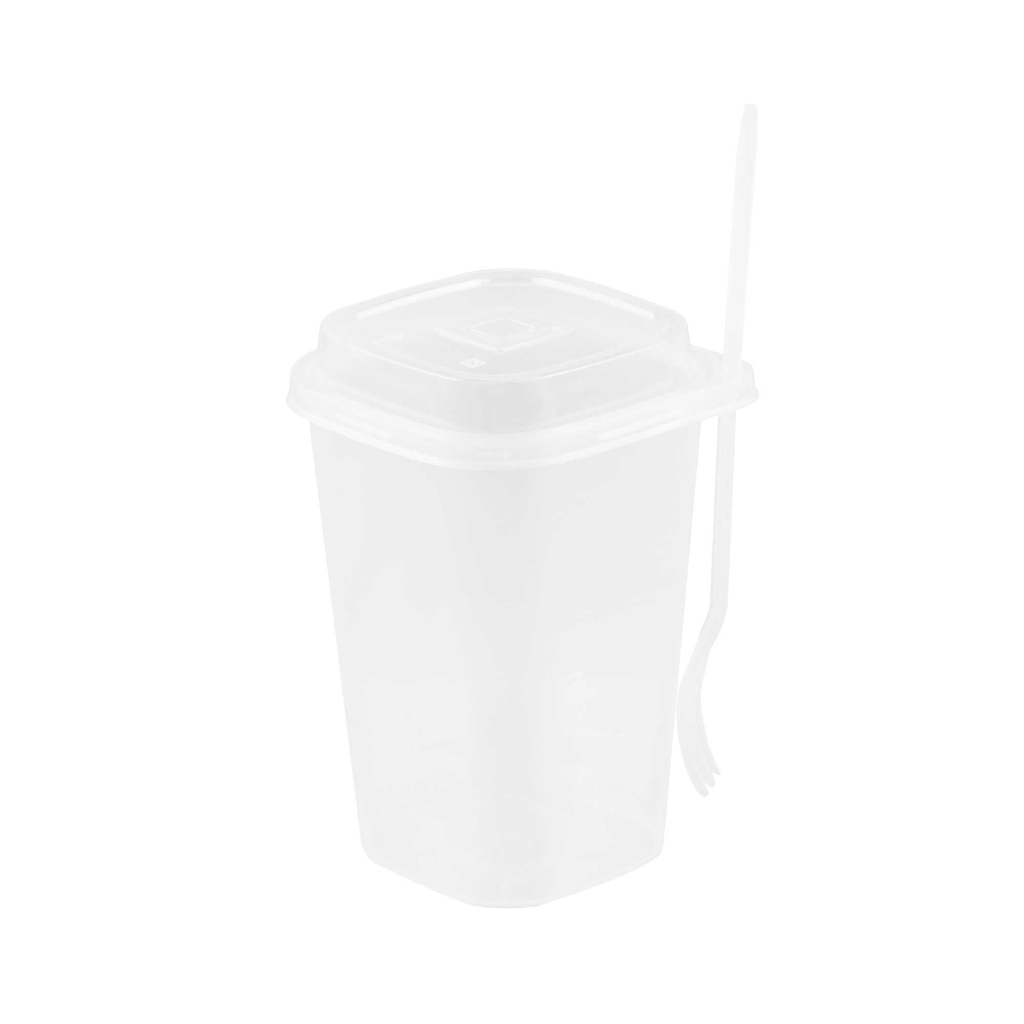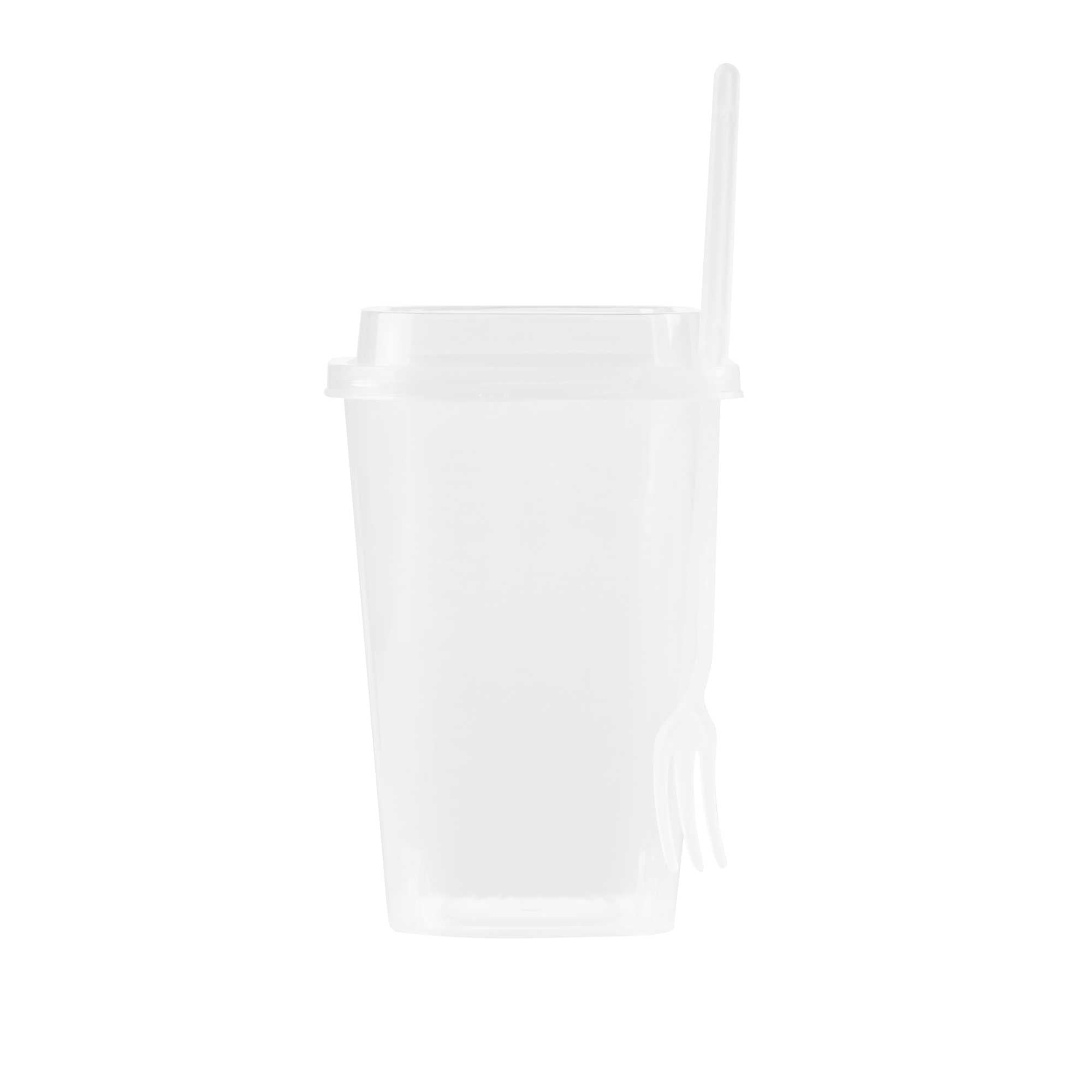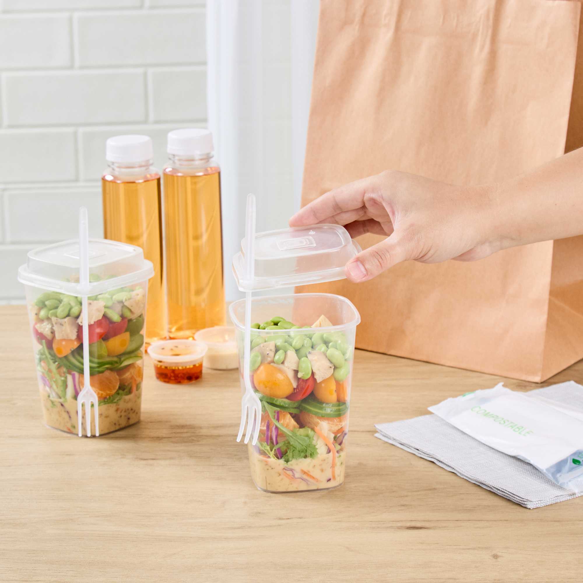 Prevent spills with a hassle-free meal prep solution. The Asporto Leakproof Plastic Food Container ensures easy transportation with its tight-sealing lid, making it an ideal plastic food container for busy foodservice settings. Engineered from plastic, this container is cold food-friendly, offering a sustainable option for your packaging needs. The included fork provides added convenience for customers enjoying salads and snacks on the go. With dimensions of 2.76 inches in length and width, and a height of 5.71 inches, these containers are perfect as meal prep containers for storing pre-portioned meals. Their clear design allows easy identification of contents, enhancing kitchen efficiency. Elevate your foodservice operation with this disposable container with a fork to offer customers a seamless dining experience. Each order includes 100 Asporto Leakproof Plastic Food Containers.