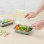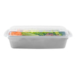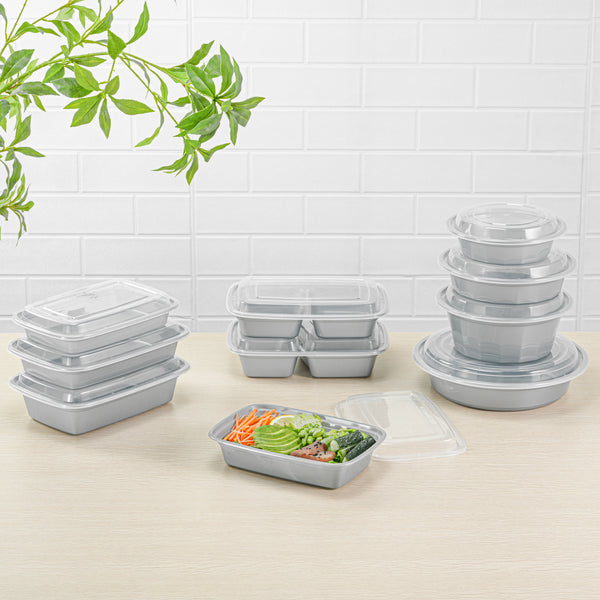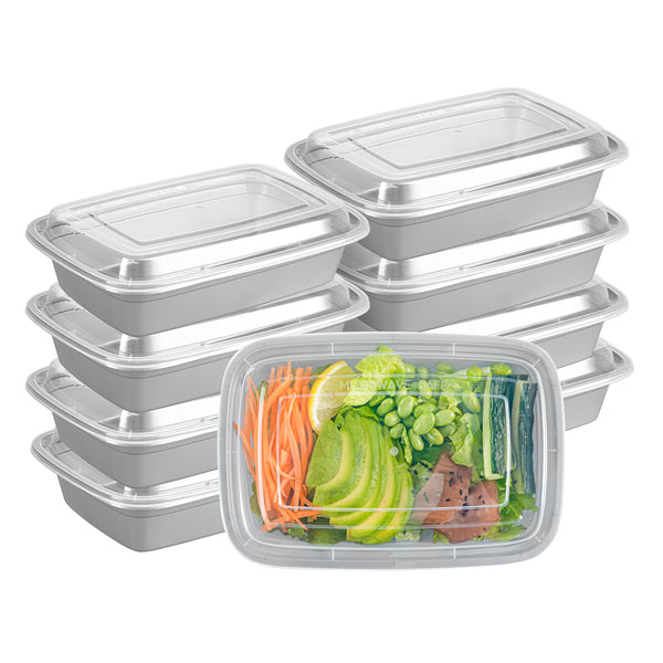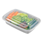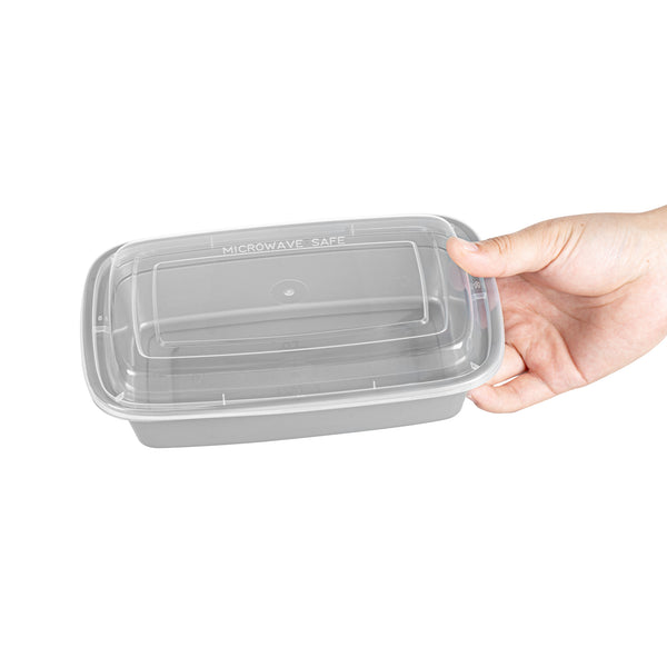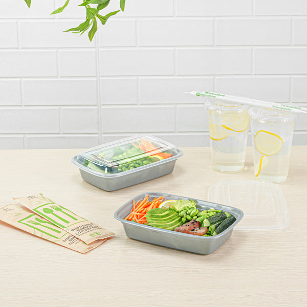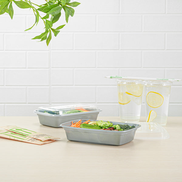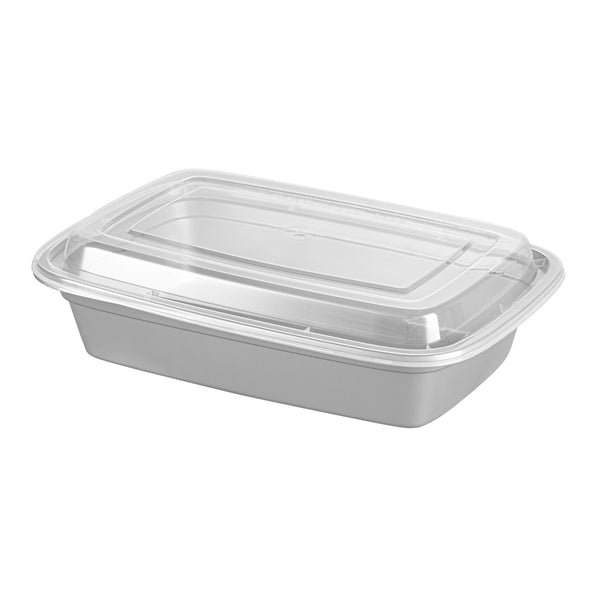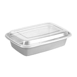 Easily package meals with our Asporto 24-ounce Rectangle Silver Plastic To Go Boxes. For an ideal take out solution, these takeaway boxes come with clear lids that form a secure seal and prevent spills in transit. These take out containers are microwave-safe and allow you to easily reheat your meals without transferring to another container. Made from BPA-free plastic, these to go containers are ideal for packing a wide variety of hot and cold food items. These to go boxes feature a sleek silver finish, adding a touch of elegance to your meal presentation. For a simplified cleanup, these meal prep containers can be easily discarded after use. These disposable take out boxes are recyclable and ideal for eco-conscious foodservice establishments. Measuring 8 inches in length by 5.25 inches in width by 1.75 inches in height, these carry out containers can hold up to 24 ounces. Sold in a 100 count box.