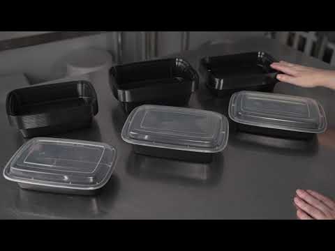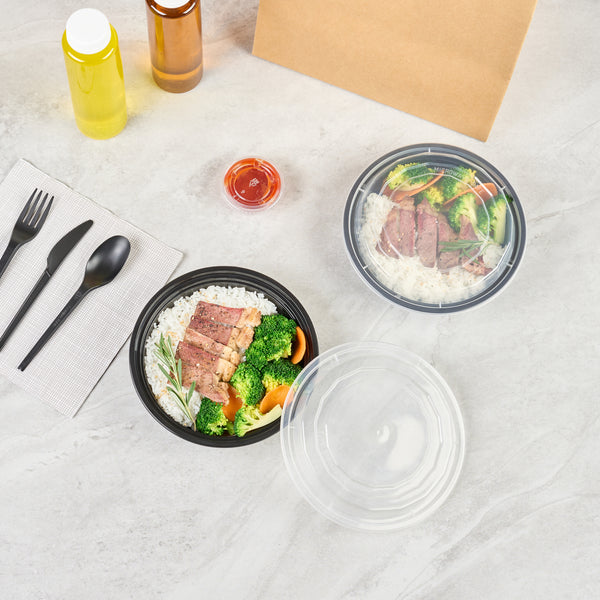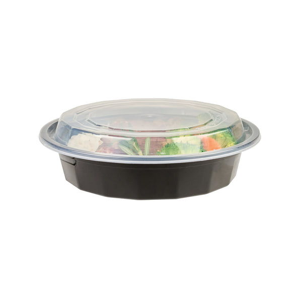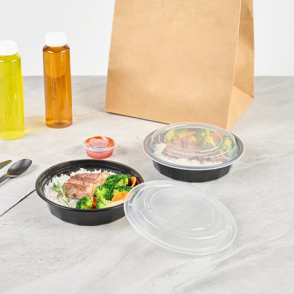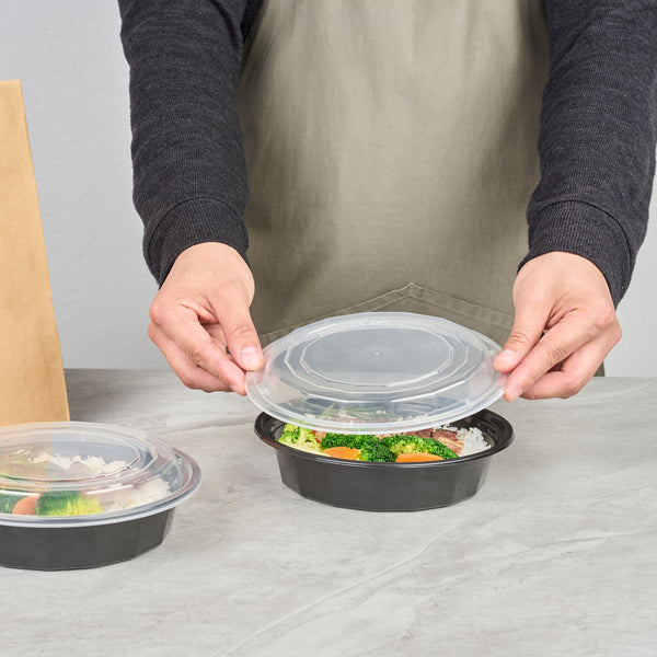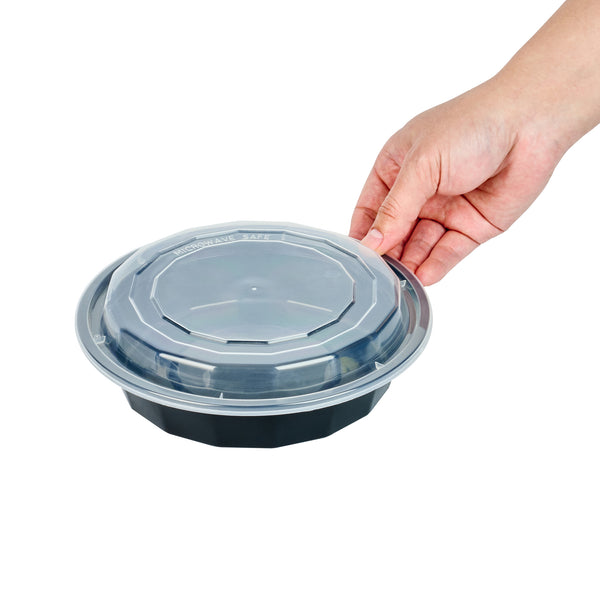 Efficiently transport your customer's hot food using our Asporto 24-ounce Round Black Plastic To Go Boxes. Made with BPA-free polypropylene plastic, these food take out containers are also heat resistant, making them perfect for all types of dishes. Each round food container includes a secure clear plastic lid that seals to prevent spills in transit. These black take out boxes are microwave-safe, giving customers the convenience of reheating meals without changing utensils. Capable of holding 24 ounces, these disposable carry out containers are ideal for sumptuous meal portions. For eco-minded establishments, these plastic to go boxes are recyclable and disposable for quick cleanup. The black finish of these takeaway containers gives a touch of sophistication to your takeaway meals. Each take out container measures 7.25 inches in diameter by 1.5 inches in height and have a capacity of 24 ounces. Sold in a 100 count box.