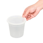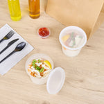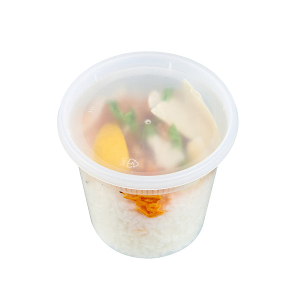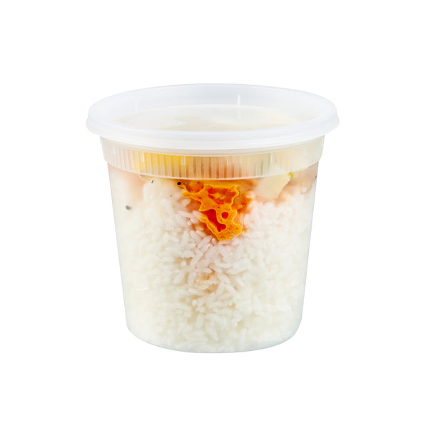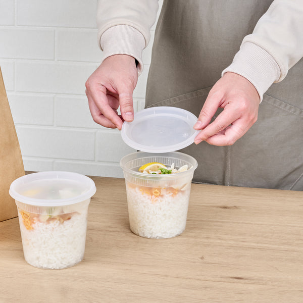 Pack soups and other dishes for take out delivery with our Asporto 24-ounce Round Clear Plastic Soup Containers. Manufactured from BPA-free plastic that is also heat-resistant, these disposable to go boxes can safely accommodate hot soups. Each round food container comes with a clear plastic lid that securely seals, significantly reducing chances of spills during delivery. These microwave-safe transparent soup containers can heat up meals without the need for switching to a different container. With a spacious 24-ounce capacity, these clear containers for take outs can hold a variety of meals. Being recyclable and disposable, these carry out containers provide an eco-conscious disposal option. The clear design of these round clear vessels allows for instant identification of the contents. These soup containers measures 4.5 inches in diameter by 4.25 inches in height and have a capacity of 24 ounces. Sold in a 25 count box. NOTE: Lids are not for microwave use.