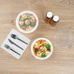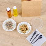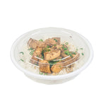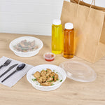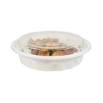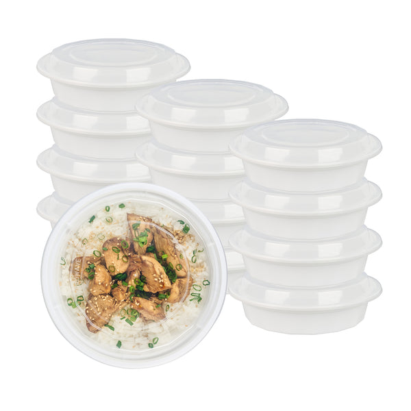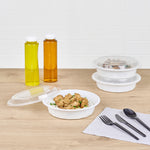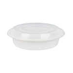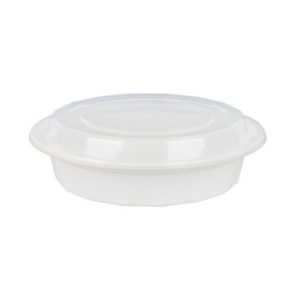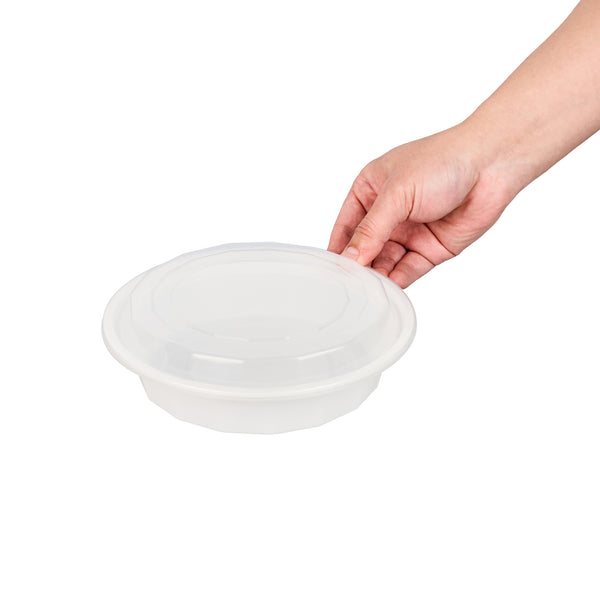 Present your customers' meals in style with our Asporto 24-ounce Round White Plastic To Go Boxes. Crafted from BPA-free polypropylene plastic, these heat-resistant food take out containers can handle varied food types. With a clear plastic lid, these round food containers forms a tight-fitting, secure seal to prevent potential leaks in transit. These white take out boxes are microwave-safe, making meal reheating convenient without utensil change. With a capacity to contain 24 ounces, these disposable carry out containers make the optimal choice to serve generous meal portions. These plastic to go boxes are recyclable and disposable, proving your commitment to the environment and making cleaning a breeze. With a white finish, these takeaway containers evokes a clean, classic look for your take out orders. These white food containers measure 7.25 inches in diameter by 1.5 inches in height and have a capacity of 24 ounces. Shipped in a 100 count box.