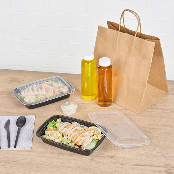 Keep your food portable and mess-free with our Asporto Microwavable Collection. Perfect for take out and delivery services, these microwavable to go containers are lightweight, heat-resistant, and BPA-free. Plus, when used with their included clear plastic lids, these microwaveable take out containers are a leak-resistant and spill-resistant way to package and serve your dishes. These rectangular plastic containers measure 8.7 inches by 6.1 inches, with a capacity of 28 ounces -- a versatile size that can be used to transport a heaping pile of creamy fettuccine alfredo or a hefty slice of cocoa powder-dusted tiramisu. These 28 oz microwavable containers with lids are available in bulk 100 count boxes.